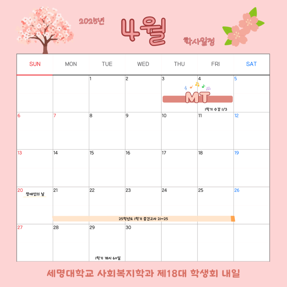 본문 시작 홈으로 커뮤니티 학과소개 교수소개 교육과정 현장실습 및 취업정보 커뮤니티 홈페이지가이드 학사일정 학과공지 학사일정 학생회 동아리 학생 소통 광장 포토갤러리 전공자료실 서식자료실 학사일정 페이스북 트위터 프린트 4월 학사 일정 사회복지학과 336 2025-09-04 2025학년도 4월 학사 일정입니다. 목록 이전3월 학사 일정 다음 5월 학사 일정 담당부서 : 사회복지학과 담당자 : - 연락처 : 043-649-1799 최종수정일 : 2024-10-26 만족도조사 만족도 조사 이 페이지에서 제공하는 정보에 대하여 만족하시나요? 매우만족 만족 보통 불만족 매우불만족