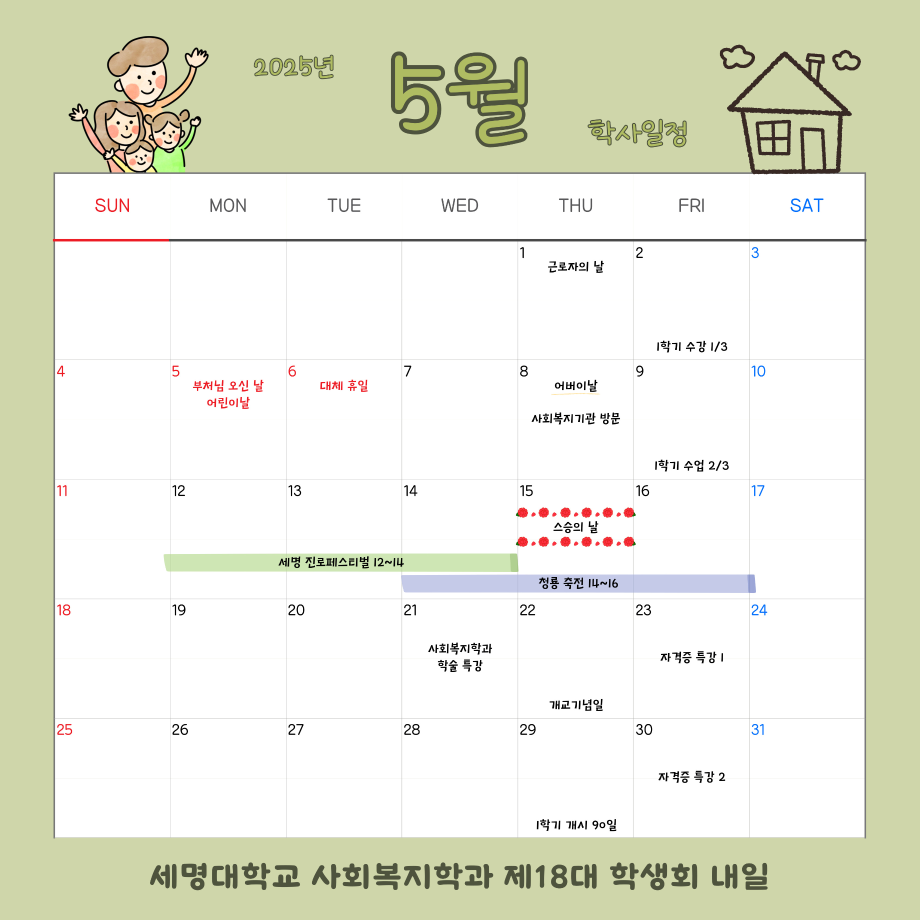 본문 시작 홈으로 커뮤니티 학과소개 교수소개 교육과정 현장실습 및 취업정보 커뮤니티 홈페이지가이드 학사일정 학과공지 학사일정 학생회 동아리 학생 소통 광장 포토갤러리 전공자료실 서식자료실 학사일정 페이스북 트위터 프린트 5월 학사 일정 사회복지학과 330 2025-09-04 2025학년도 5월 학사 일정입니다. 목록 이전4월 학사 일정 다음 6월 학사 일정 담당부서 : 사회복지학과 담당자 : - 연락처 : 043-649-1799 최종수정일 : 2024-10-26 만족도조사 만족도 조사 이 페이지에서 제공하는 정보에 대하여 만족하시나요? 매우만족 만족 보통 불만족 매우불만족