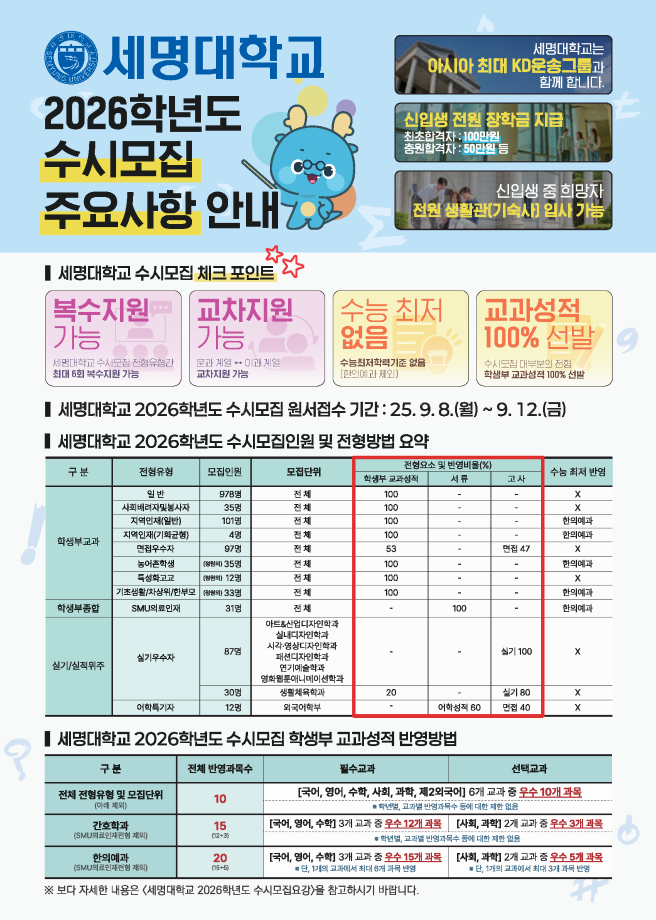 본문 시작 홈으로 학부활동 학부소개 학부활동 교육과정 커뮤니티 학부생활 입학안내 홈페이지가이드 학부갤러리 학부행사 학생회 활동 전공 동아리 학부갤러리 학부갤러리 페이스북 트위터 프린트 2026학년도 수시모집 주요사항 전체관리자 723 2025-09-03 2026학년도 수시모집 주요사항 안내 목록 이전컴퓨터학부 소개 다음 컴퓨터학부 윈도우즈프로그래밍 전공 실습 담당부서 : 컴퓨터학부 담당자 : - 연락처 : 043-649-1272 최종수정일 : 2024-10-26 만족도조사 만족도 조사 이 페이지에서 제공하는 정보에 대하여 만족하시나요? 매우만족 만족 보통 불만족 매우불만족