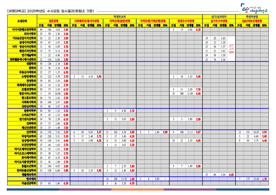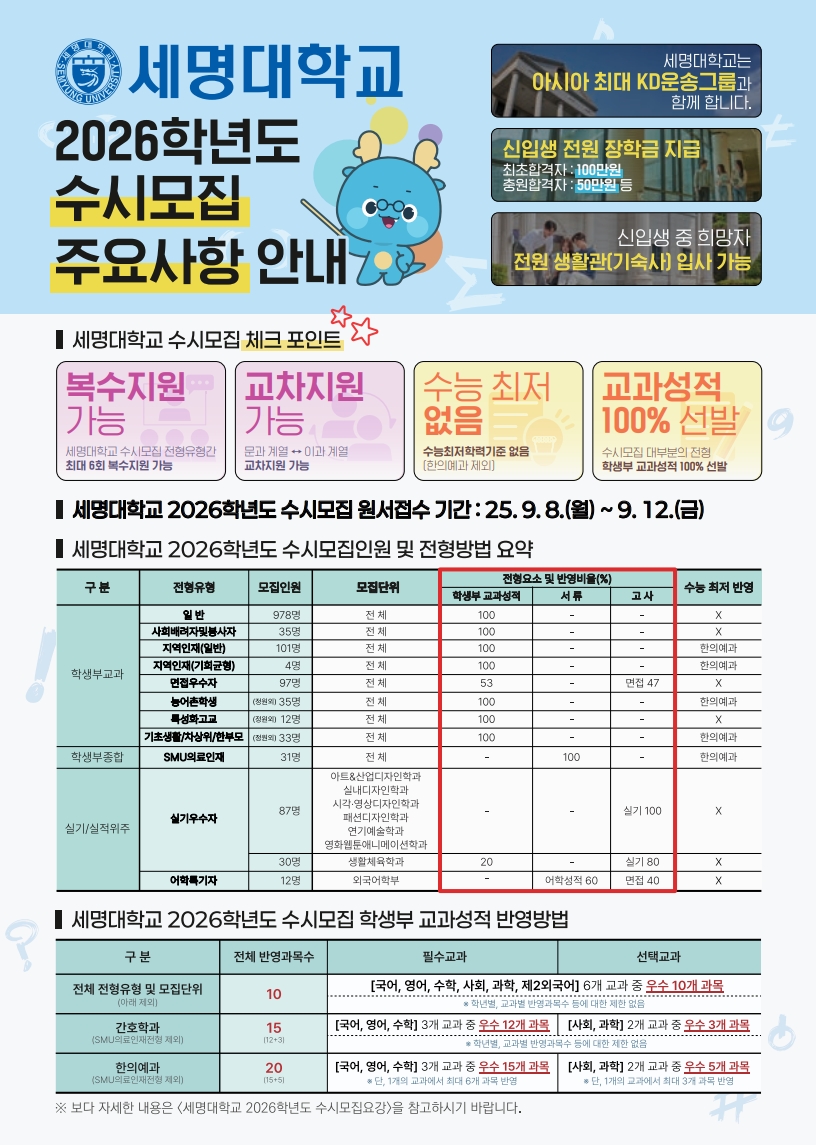 본문 시작 홈으로 SMIT 소식 SMIT 소개 SMIT 교육 SMIT 취업 SMIT 소식 SMIT 입학 홈페이지가이드 공지사항 공지사항 갤러리 경진대회 동아리 공지사항 페이스북 트위터 프린트 ★ 2026 수시모집 주요사항 및 전년도 입시결과 안내 ★ 스마트IT학부 조회 : 487 등록일 : 2025-08-22 세명대_2026수시모집 주요사항 및 전년도 입시결과.pdf ( 550 kb) ?atchFileId=FILE_000000000228086&fileSn=0 세명대_2026수시모집 주요사항 및 전년도 입시결과.pdf ★ 2026 수시모집 주요사항 및 전년도 입시결과 안내 ★ 목록 이전경험이 실력이 되는 대학 세명대학교! 다음 ★ 2025학년도 2학기 통학버스 운행사항 안내 ★ 담당부서 : 스마트IT학부 담당자 : - 연락처 : 043-649-1275 최종수정일 : 2024-10-26 만족도조사 만족도 조사 이 페이지에서 제공하는 정보에 대하여 만족하시나요? 매우만족 만족 보통 불만족 매우불만족