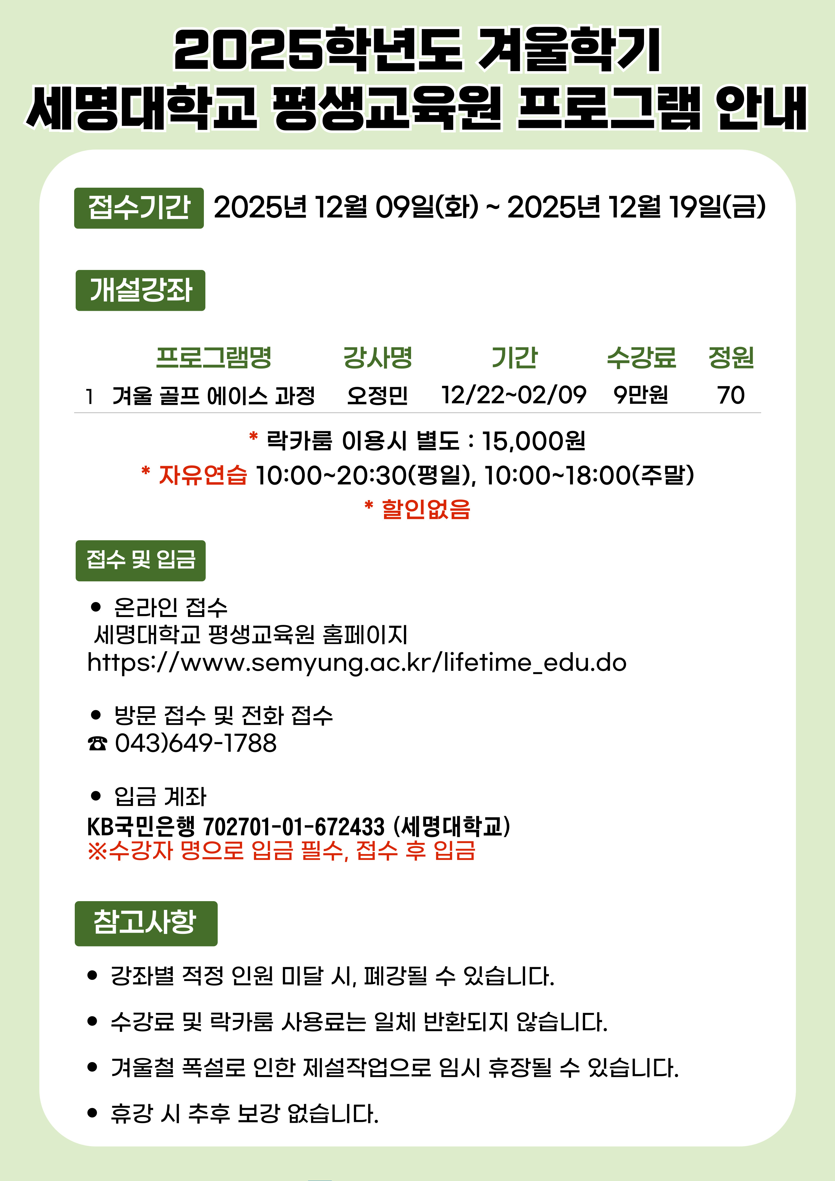 본문 시작 2025학년도 겨울학기 평생교육원 수강생 모집 안내 평생교육원 조회 : 299 등록일 : 2025-12-03 *겨울학기 골프강좌의 경우, 할인율이 적용되지 않으므로 할인적용 → 해당없음으로 신청 바랍니다. 목록 이전평생 직업교육 프로그램 강의실 위치 안내도 담당부서 : 평생교육원 담당자 : - 연락처 : 043-649-1788 최종수정일 : 2024-10-26 만족도조사 만족도 조사 이 페이지에서 제공하는 정보에 대하여 만족하시나요? 매우만족 만족 보통 불만족 매우불만족