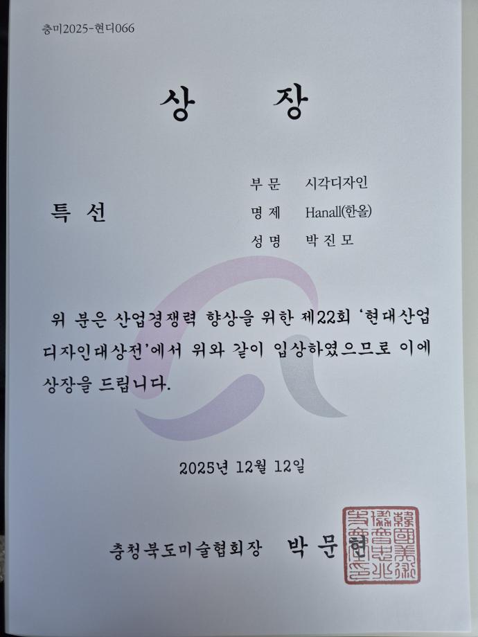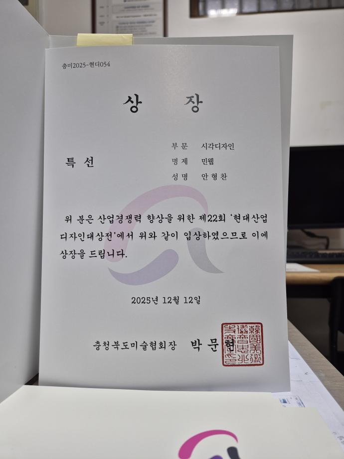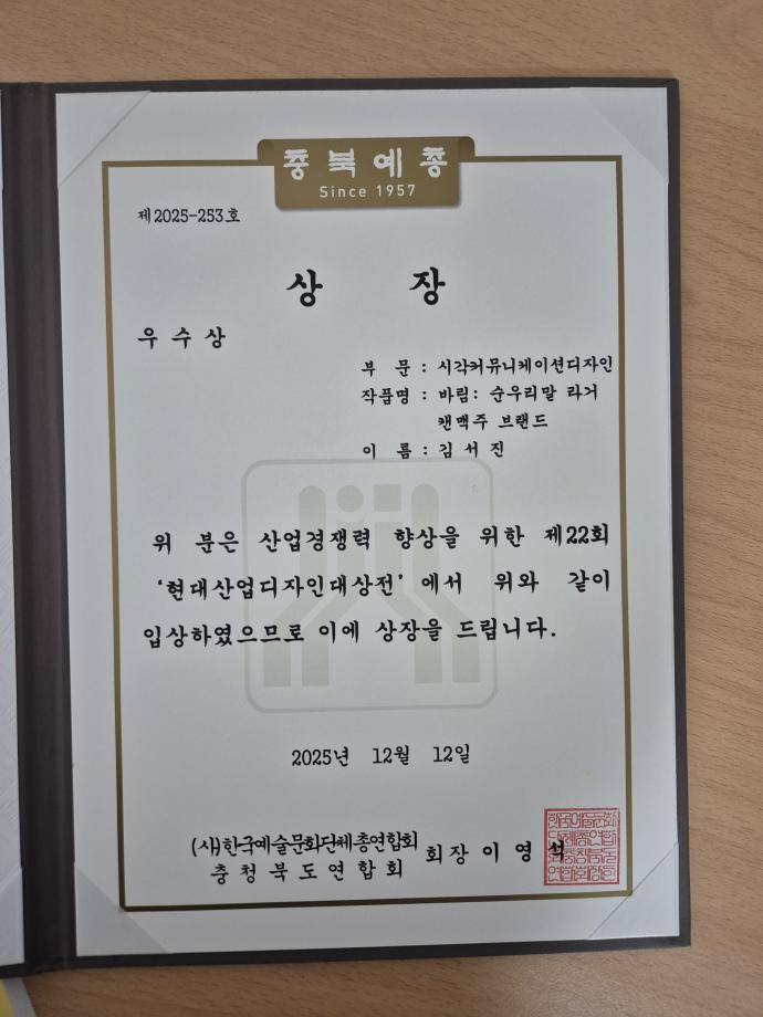 본문 시작 홈으로 학과자랑 학과소개 학과과정 시영소식 입학/취업 AI 학과자랑 SNS소통 홈페이지가이드 학과갤러리 학과자랑 학과갤러리 동아리 졸업전시회 학과갤러리 페이스북 트위터 프린트 제22회 현대산업디자인대상전 - 우수상, 특선 등 수상작 시각영상디자인학과 128 2025-12-13 우수상 - 1작, 특선 - 3작 입선 다수를 수상하엿습니다 목록 이전K-콘텐츠스쿨 의병제 문화 개발 교육프로그램 - 시각영상디자인학과 참여 학생 전시 담당부서 : 시각영상디자인학과 담당자 : - 연락처 : 043-649-1726 최종수정일 : 2024-10-26 만족도조사 만족도 조사 이 페이지에서 제공하는 정보에 대하여 만족하시나요? 매우만족 만족 보통 불만족 매우불만족