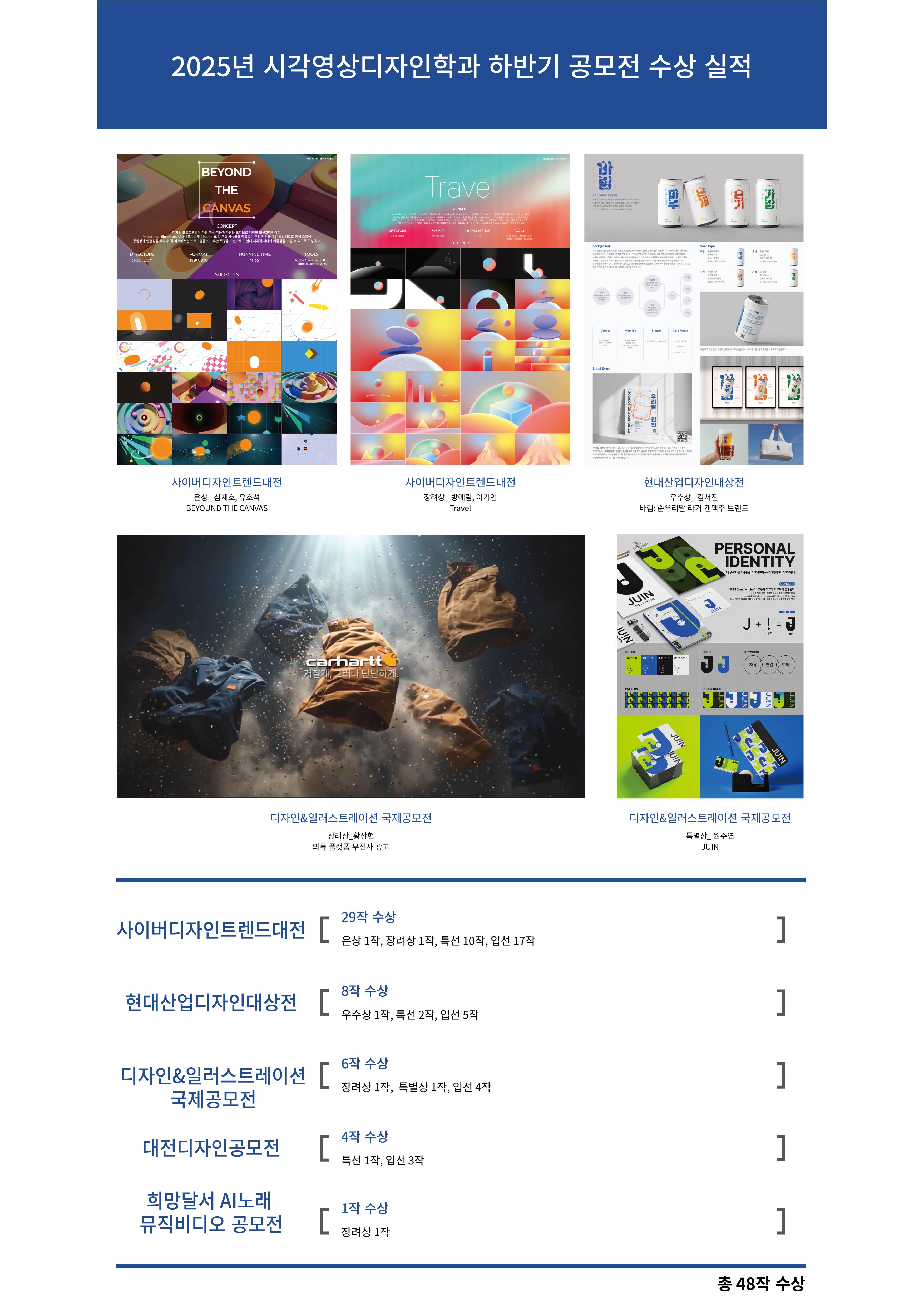 본문 시작 홈으로 학과자랑 학과소개 학과과정 시영소식 입학/취업 AI 학과자랑 SNS소통 홈페이지가이드 학과갤러리 학과자랑 학과갤러리 동아리 졸업전시회 학과갤러리 페이스북 트위터 프린트 2025년 시각영상디자인학과 하반기 공모전 수상 실적 시각영상디자인학과 154 2025-12-13 목록 이전K-콘텐츠스쿨 의병제 문화 개발 교육프로그램 - 시각영상디자인학과 참여 학생 전시 다음 2025년 시각영상디자인학과 공모전 수상 실적 담당부서 : 시각영상디자인학과 담당자 : - 연락처 : 043-649-1726 최종수정일 : 2024-10-26 만족도조사 만족도 조사 이 페이지에서 제공하는 정보에 대하여 만족하시나요? 매우만족 만족 보통 불만족 매우불만족