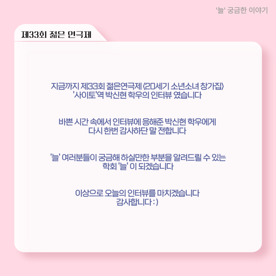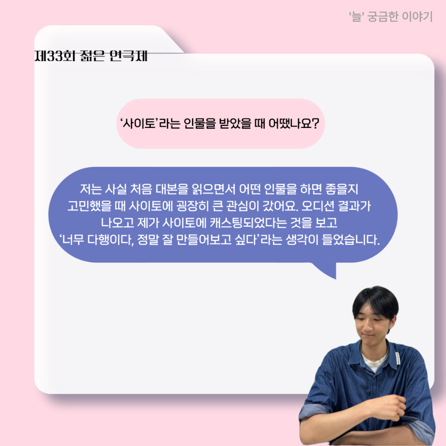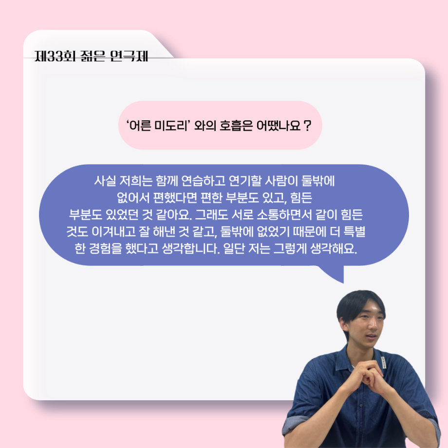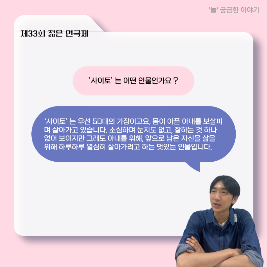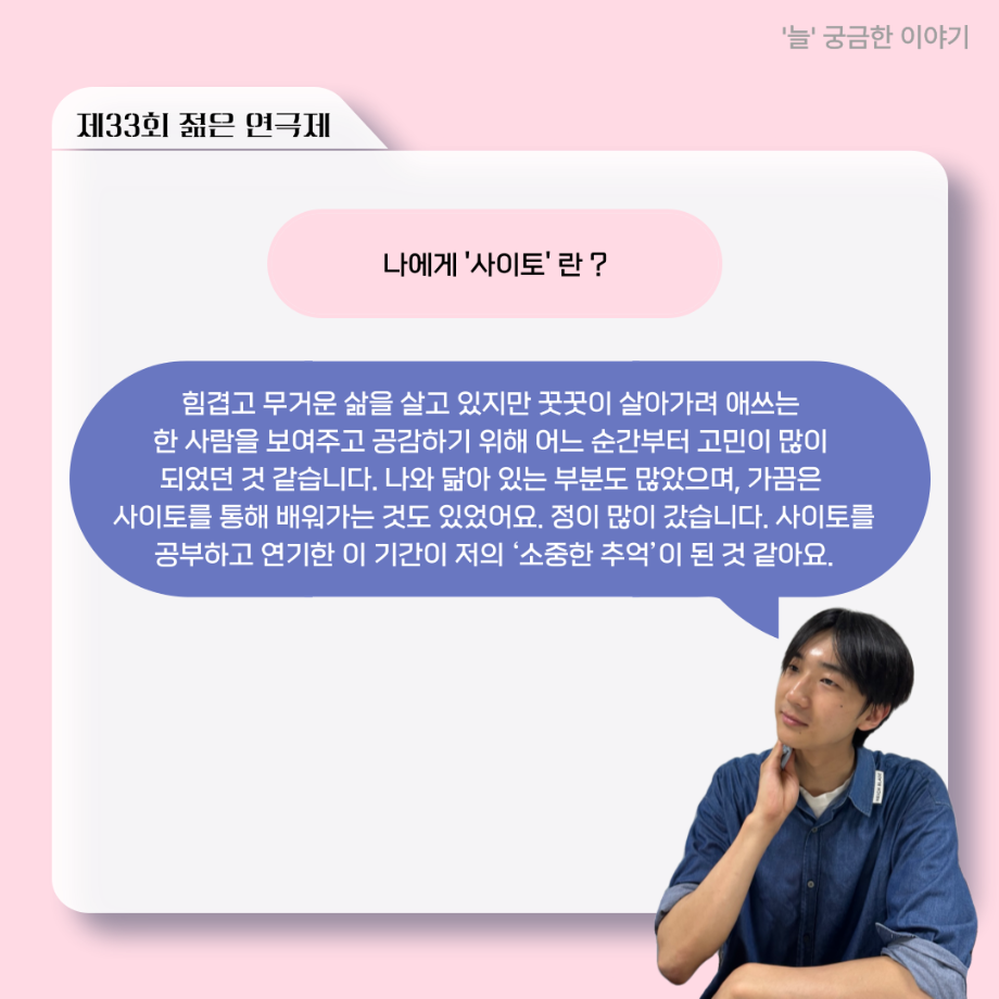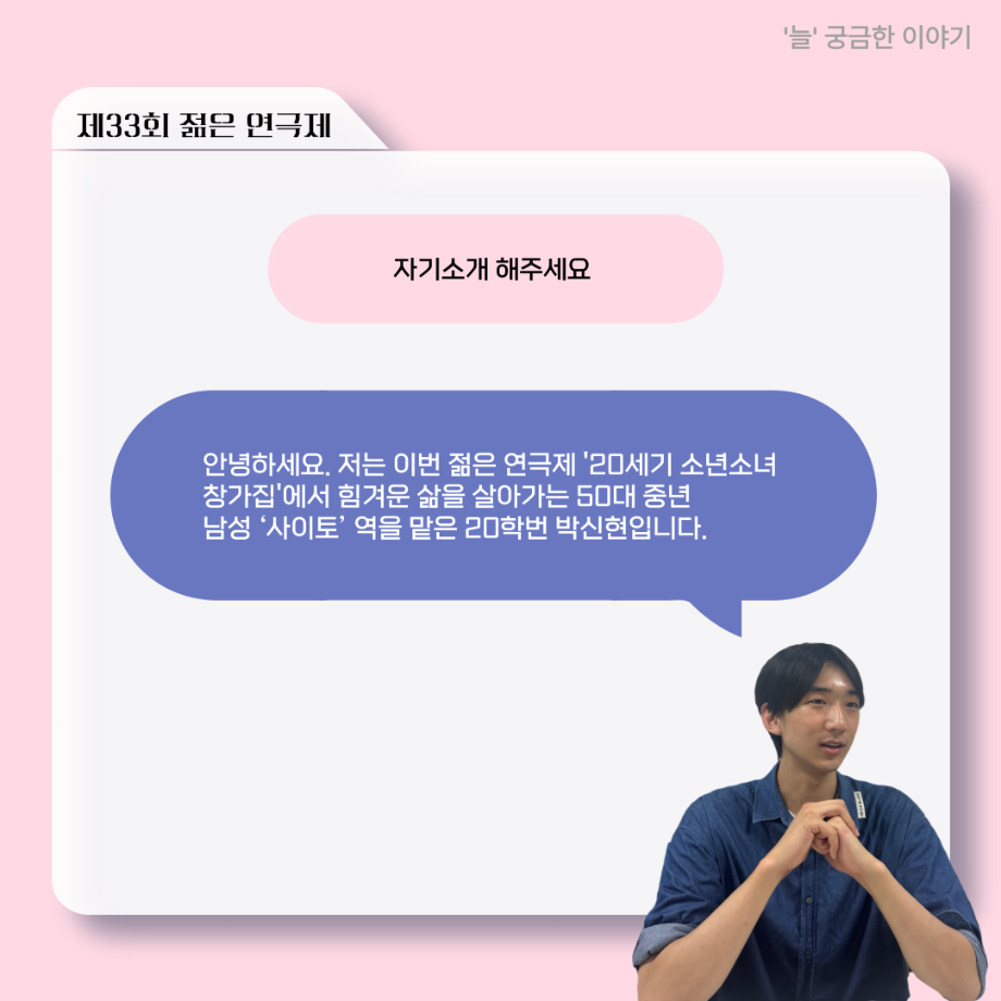 본문 시작 홈으로 커뮤니티 학과소개 입학정보 교수소개 학과과정 커뮤니티 공연예매 안내 홈페이지가이드 포토갤러리 공지사항 포토갤러리 작품DB 동아리 학사일정 학생회 포토갤러리 페이스북 트위터 프린트 ‘늘‘ 궁금한 이야기 - 젊은연극제 ‘20세기 소년소녀 창가집’ 사이토 役 < 박신현 > 연기예술학과 621 2025-08-15 . 목록 다음 2025년 세명대학교 연기예술학과 2학기 개강총회 다음 ‘늘‘ 궁금한 이야기 - 젊은연극제 ‘20세기 소년소녀 창가집’ 종이연극 아저씨 役 < 윤준호 > 담당부서 : 연기예술학과 담당자 : - 연락처 : 043-649-1733 최종수정일 : 2024-10-26 만족도조사 만족도 조사 이 페이지에서 제공하는 정보에 대하여 만족하시나요? 매우만족 만족 보통 불만족 매우불만족