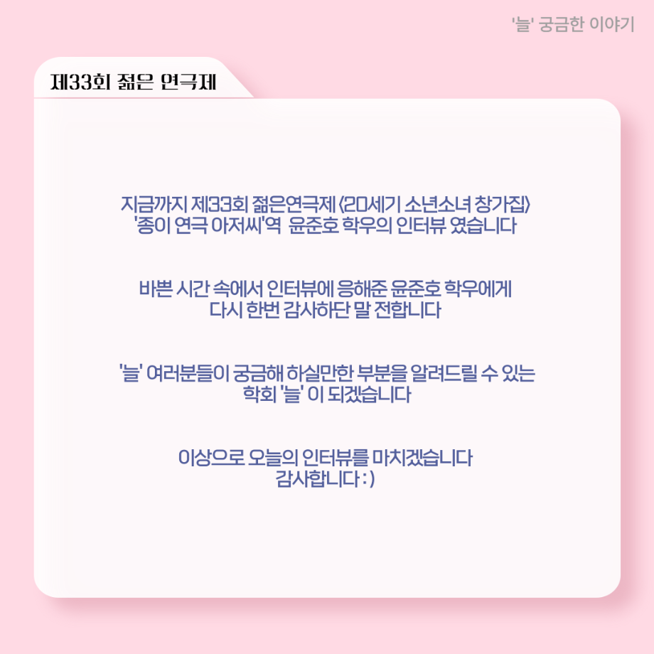 본문 시작 홈으로 커뮤니티 학과소개 입학정보 교수소개 학과과정 커뮤니티 공연예매 안내 홈페이지가이드 포토갤러리 공지사항 포토갤러리 작품DB 동아리 학사일정 학생회 포토갤러리 페이스북 트위터 프린트 ‘늘‘ 궁금한 이야기 - 젊은연극제 ‘20세기 소년소녀 창가집’ 종이연극 아저씨 役 < 윤준호 > 연기예술학과 943 2025-08-28 . 목록 이전‘늘‘ 궁금한 이야기 - 젊은연극제 ‘20세기 소년소녀 창가집’ 사이토 役 < 박신현 > 다음 ‘늘‘ 궁금한 이야기 - 젊은연극제 ‘20세기 소년소녀 창가집’ 다큐pd 役 < 임재완 > 담당부서 : 연기예술학과 담당자 : - 연락처 : 043-649-1733 최종수정일 : 2024-10-26 만족도조사 만족도 조사 이 페이지에서 제공하는 정보에 대하여 만족하시나요? 매우만족 만족 보통 불만족 매우불만족