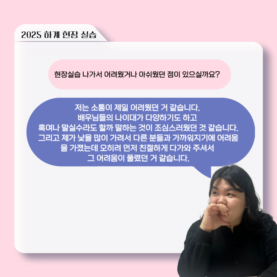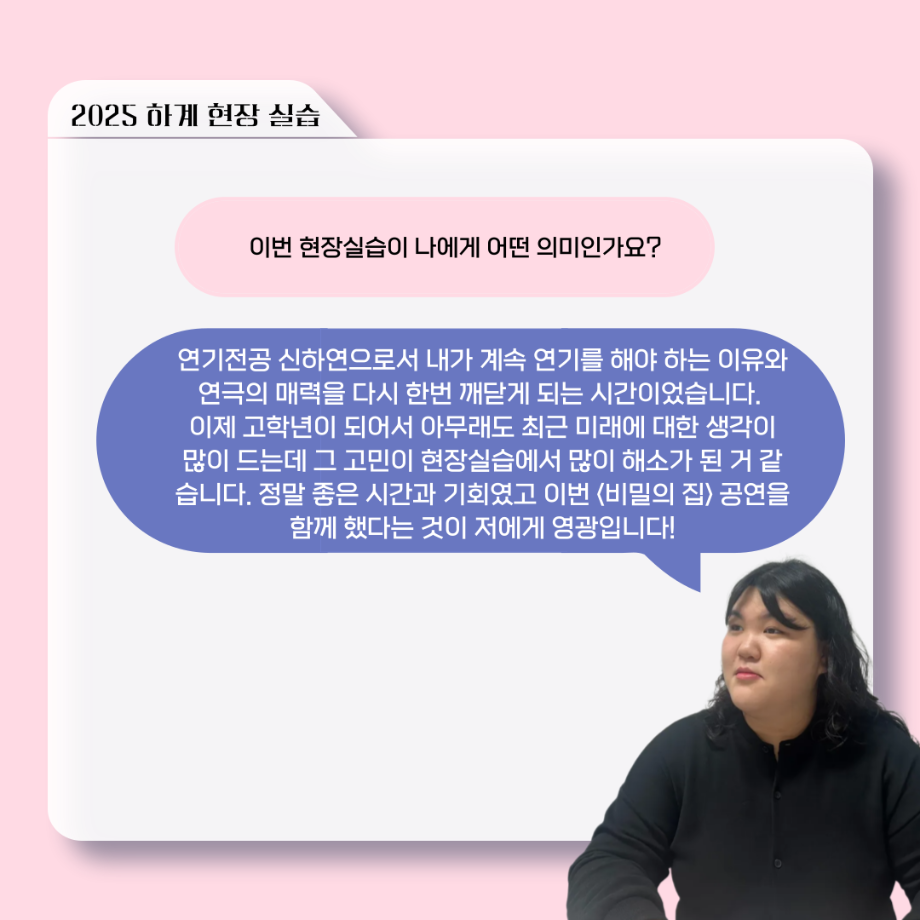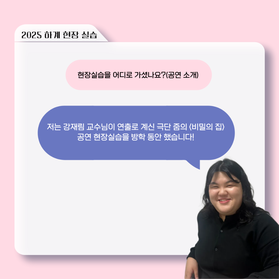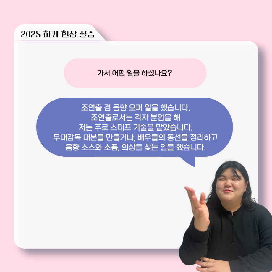 본문 시작 홈으로 커뮤니티 학과소개 입학정보 교수소개 학과과정 커뮤니티 공연예매 안내 홈페이지가이드 포토갤러리 공지사항 포토갤러리 작품DB 동아리 학사일정 학생회 포토갤러리 페이스북 트위터 프린트 ‘늘‘ 궁금한 이야기 - 현장실습 < 신하연 > 연기예술학과 465 2025-10-16 . 목록 이전117회 세명대학교 연기예술학과 하계프로젝트 사랑의 온도 배우 소개 다음 ‘늘‘ 궁금한 이야기 - 하계 프로젝트 ‘컨택’팀 고진役 < 조진석 > 담당부서 : 연기예술학과 담당자 : - 연락처 : 043-649-1733 최종수정일 : 2024-10-26 만족도조사 만족도 조사 이 페이지에서 제공하는 정보에 대하여 만족하시나요? 매우만족 만족 보통 불만족 매우불만족