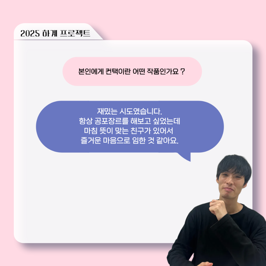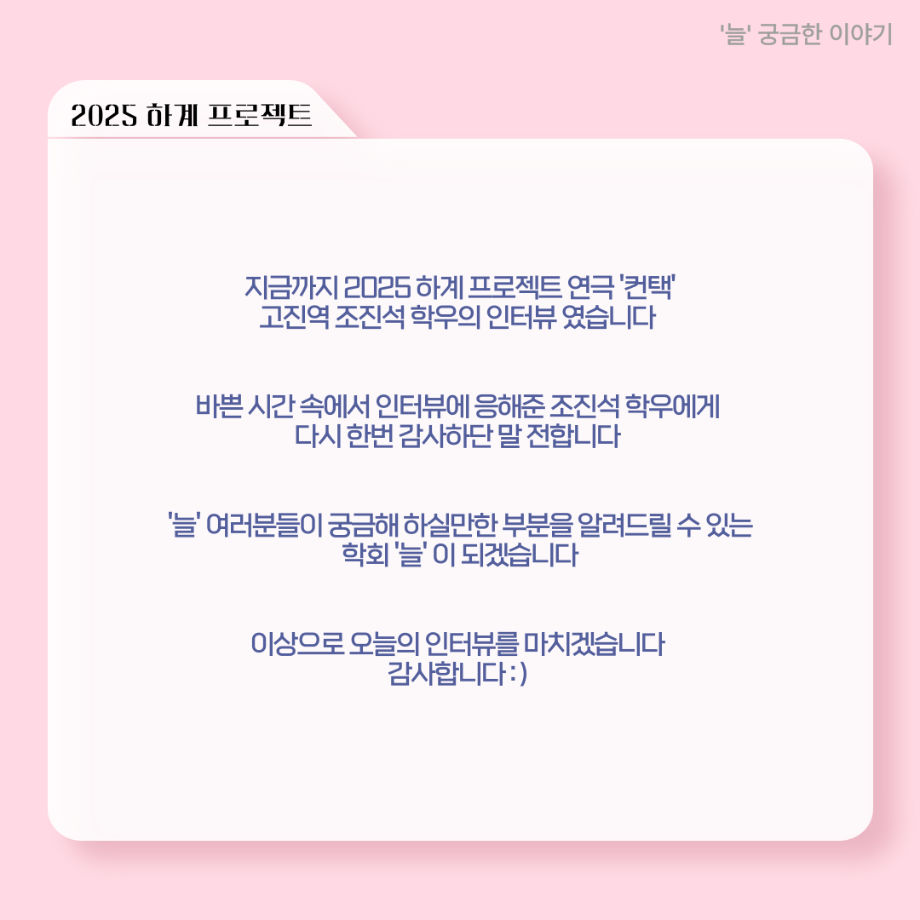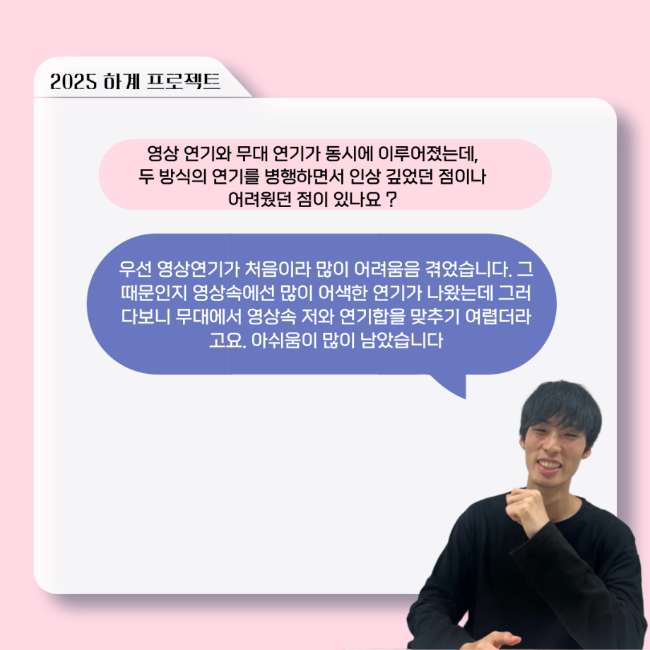 본문 시작 홈으로 커뮤니티 학과소개 입학정보 교수소개 학과과정 커뮤니티 공연예매 안내 홈페이지가이드 포토갤러리 공지사항 포토갤러리 작품DB 동아리 학사일정 학생회 포토갤러리 페이스북 트위터 프린트 ‘늘‘ 궁금한 이야기 - 하계 프로젝트 ‘컨택’팀 고진役 < 조진석 > 연기예술학과 1265 2025-10-31 . 목록 이전‘늘‘ 궁금한 이야기 - 현장실습 < 신하연 > 다음 세명대학교 연기예술학과 과체전 담당부서 : 연기예술학과 담당자 : - 연락처 : 043-649-1733 최종수정일 : 2024-10-26 만족도조사 만족도 조사 이 페이지에서 제공하는 정보에 대하여 만족하시나요? 매우만족 만족 보통 불만족 매우불만족