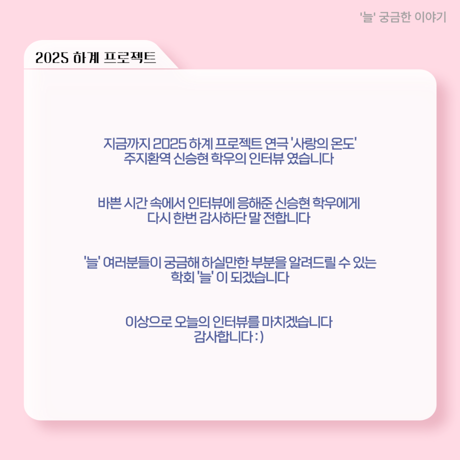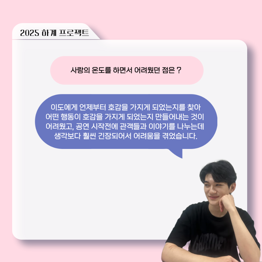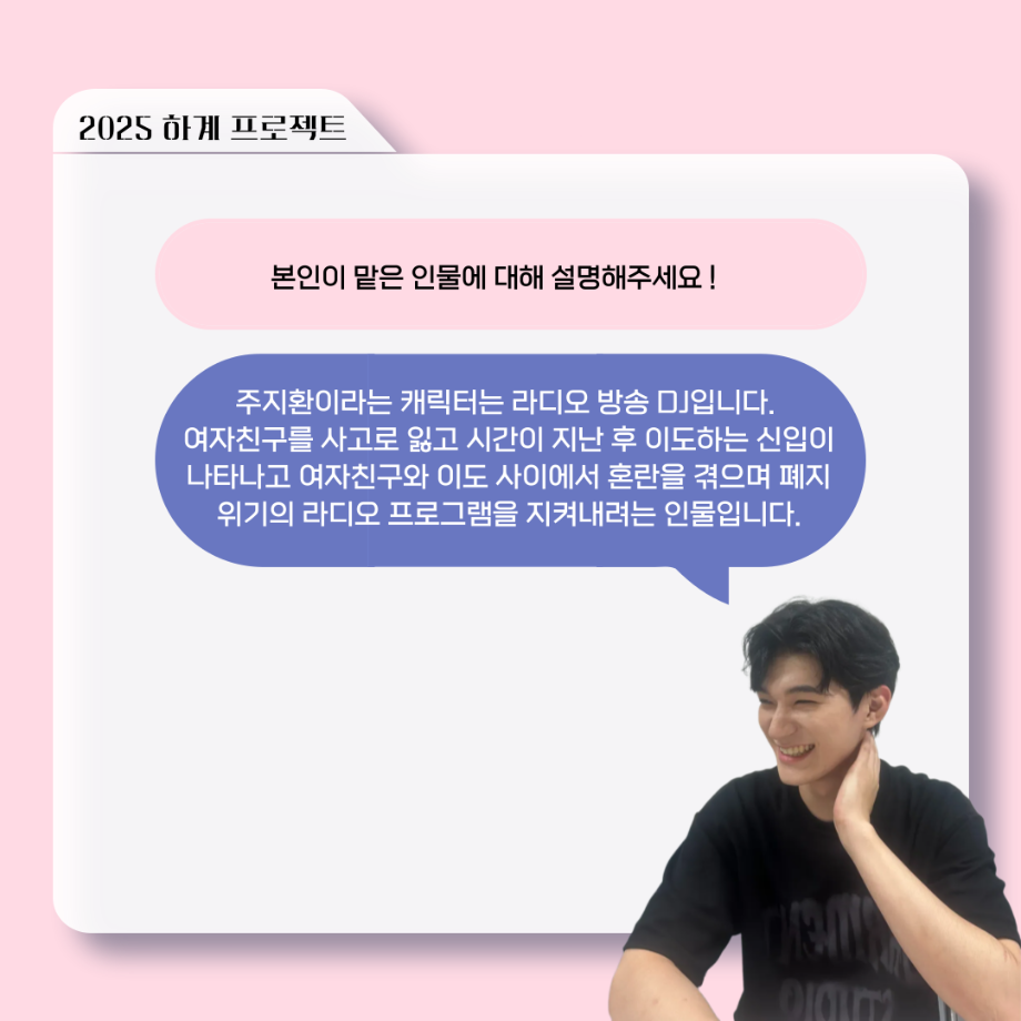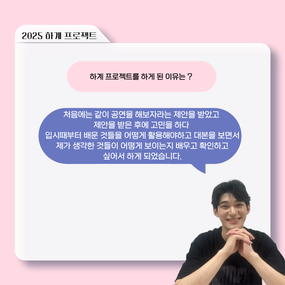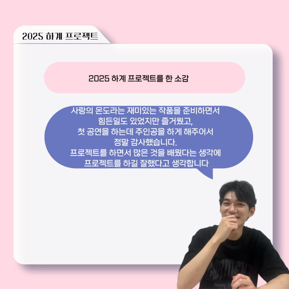 본문 시작 홈으로 커뮤니티 학과소개 입학정보 교수소개 학과과정 커뮤니티 공연예매 안내 홈페이지가이드 포토갤러리 공지사항 포토갤러리 작품DB 동아리 학사일정 학생회 포토갤러리 페이스북 트위터 프린트 ‘늘‘ 궁금한 이야기 - 하계 프로젝트 ‘사랑의 온도’팀 주지환役 < 신승현 > 연기예술학과 160 2025-11-11 . 목록 이전‘늘‘ 궁금한 이야기 - 하계 프로젝트 ‘사랑의 온도’팀 서이도役 < 함유진 > 다음 ‘늘‘ 궁금한 이야기 - 2025 졸업작품 ‘유랑극장’ 노풍찬役 < 김은혁 > 담당부서 : 연기예술학과 담당자 : - 연락처 : 043-649-1733 최종수정일 : 2024-10-26 만족도조사 만족도 조사 이 페이지에서 제공하는 정보에 대하여 만족하시나요? 매우만족 만족 보통 불만족 매우불만족