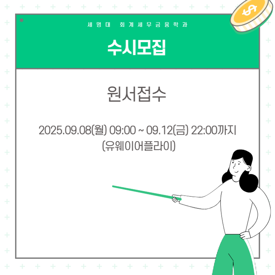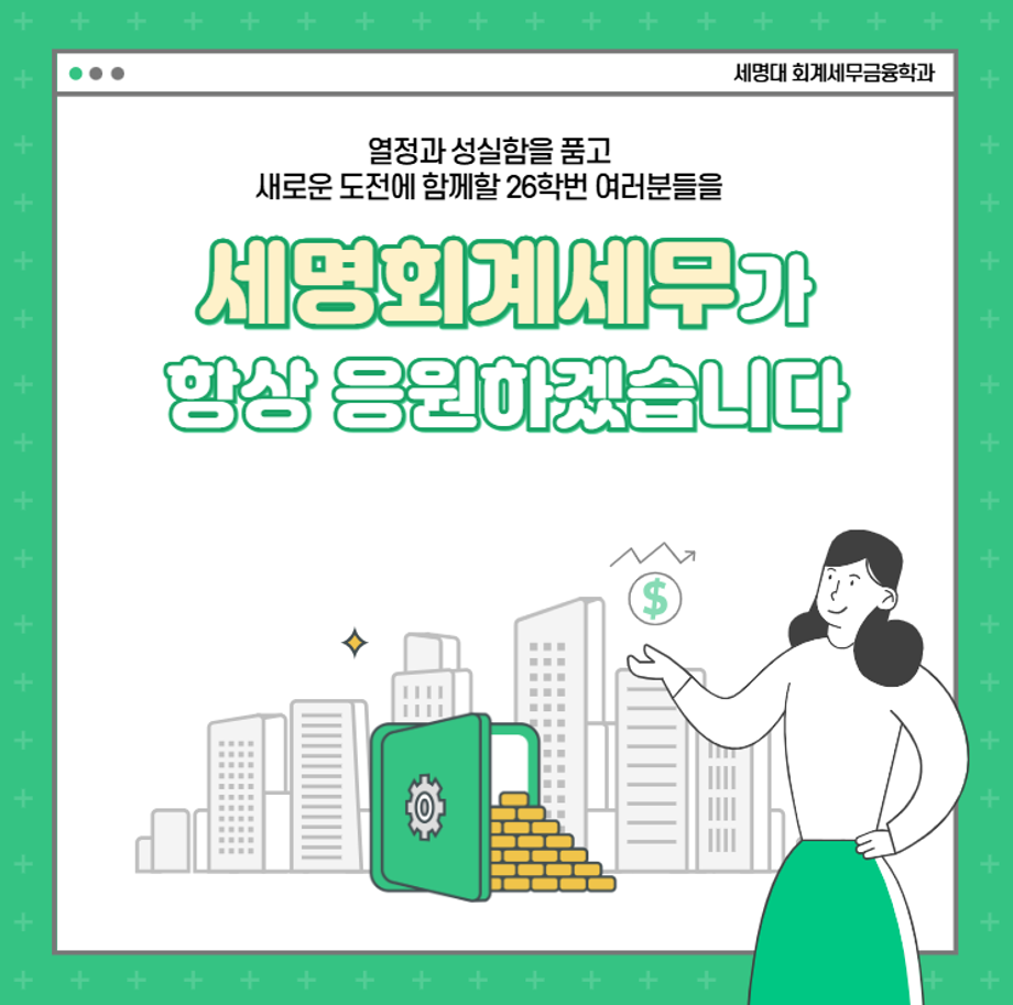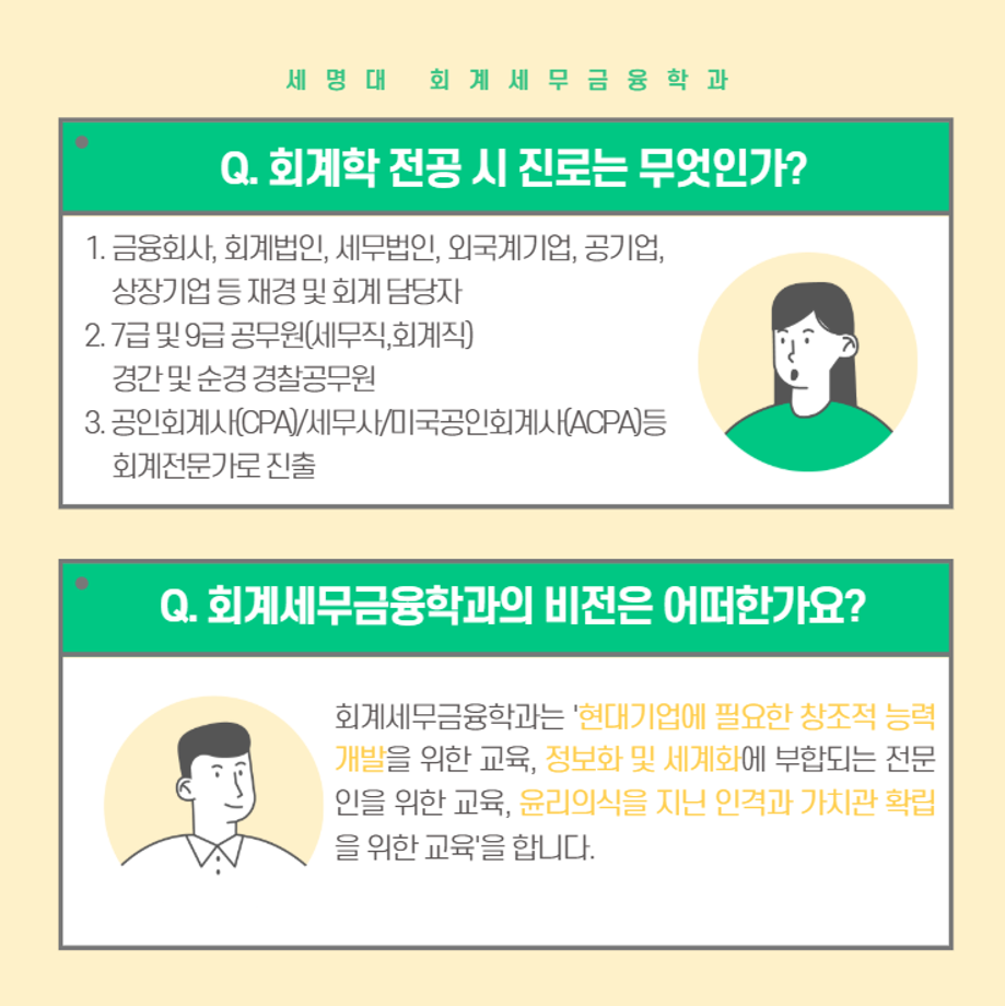 본문 시작 홈으로 학과소식 학과소개 취업정보 교육과정 학과소식 홈페이지가이드 포토갤러리 공지사항 포토갤러리 학과이야기 학과행사 포토갤러리 페이스북 트위터 프린트 💙2026학년도 회계세무금융학과 신입생모집 카드뉴스💙 회계세무금융학과 264 2025-09-09 2026학년도 회계세무금융학과 신입생모집 카드뉴스 목록 이전9월 학사일정 다음 💙세명대 회계세무금융학과 진로 로드맵💙 담당부서 : 회계세무학과 담당자 : - 연락처 : 043-649-1244 최종수정일 : 2024-10-26 만족도조사 만족도 조사 이 페이지에서 제공하는 정보에 대하여 만족하시나요? 매우만족 만족 보통 불만족 매우불만족
