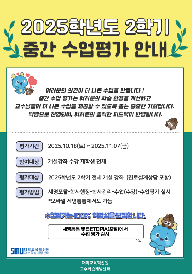 본문 시작 홈으로 학과소식 학과소개 교육과정 학과소식 학과작품 학과SNS 서울대학로 민송아트홀 홈페이지가이드 공지사항 공지사항 학과뉴스 공모전 동아리 포토갤러리 공지사항 페이스북 트위터 프린트 2025학년도 2학기 중간 수업 평가 안내 영화웹툰애니메이션학과 조회 : 140 등록일 : 2025-10-17 목록 이전2025-2학기 학습법 프로그램 참여 안내 다음 세명대학교 도서관과 함께하는 무료 토익 이벤트 만족도조사 만족도 조사 이 페이지에서 제공하는 정보에 대하여 만족하시나요? 매우만족 만족 보통 불만족 매우불만족
