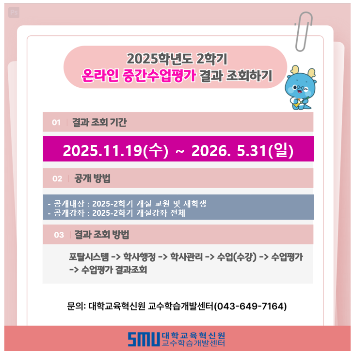 본문 시작 홈으로 커뮤니티 학부소개 진로·취업 교육과정 커뮤니티 대학원 입학상담 홈페이지가이드 공지사항 공지사항 갤러리 학생회 동문회 전공자료실 전공동아리 Youtube Instagram 공지사항 페이스북 트위터 프린트 [설문안내] 2025학년도 2학기 온라인 중간수업평가 결과 조회 안내 바이오식품영양학부 조회 : 39 등록일 : 2025-11-19 목록 이전[모집안내] 2025학년도 동계 표준/자율 현장실습 학생 모집 다음 [장학금안내] 2026학년도 1학기 주거안정장학금 신청 안내 담당부서 : 바이오식품영양학부 담당자 : - 연락처 : 043-649-1578 최종수정일 : 2024-10-26 만족도조사 만족도 조사 이 페이지에서 제공하는 정보에 대하여 만족하시나요? 매우만족 만족 보통 불만족 매우불만족