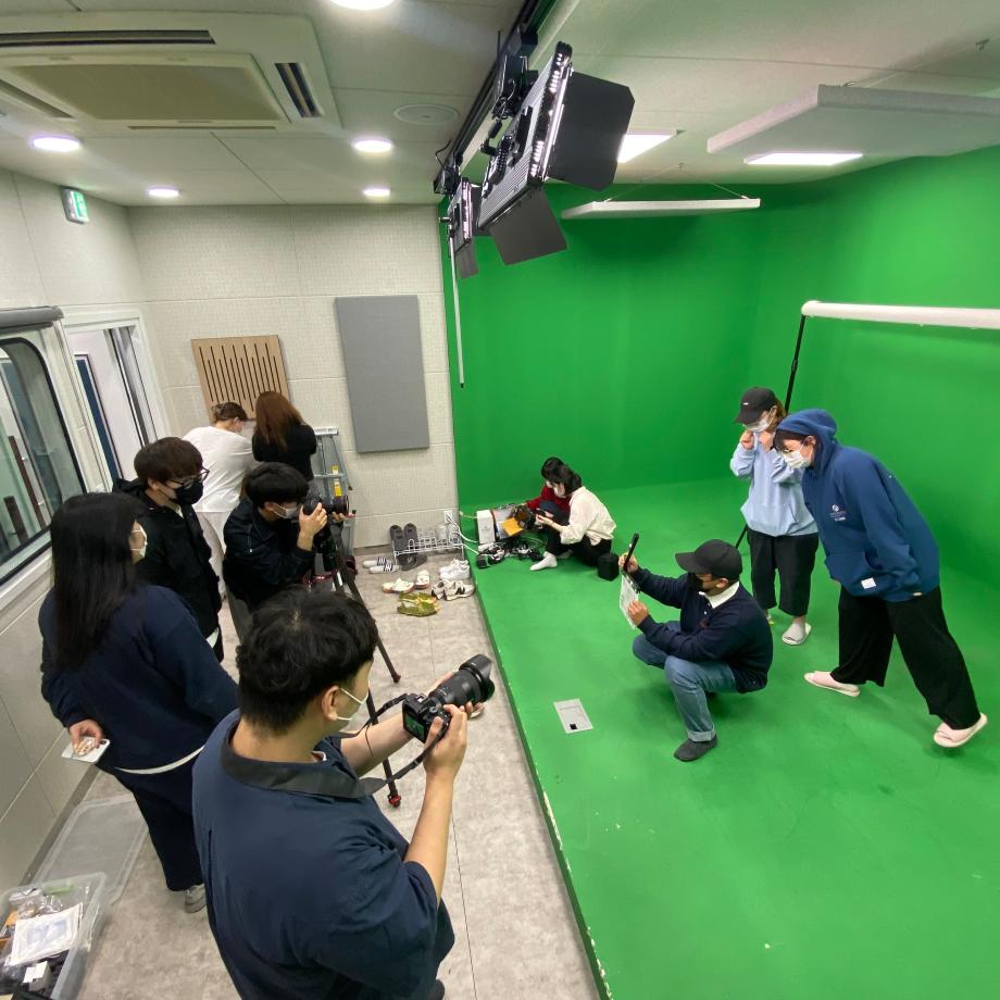 사진은 크로마키 스튜디오에서 학생들이 촬영 연습을 하는 모습이에요! 어때요? 미디어문화학부에서 영상을 만들어 보고 싶지 않으신가요?