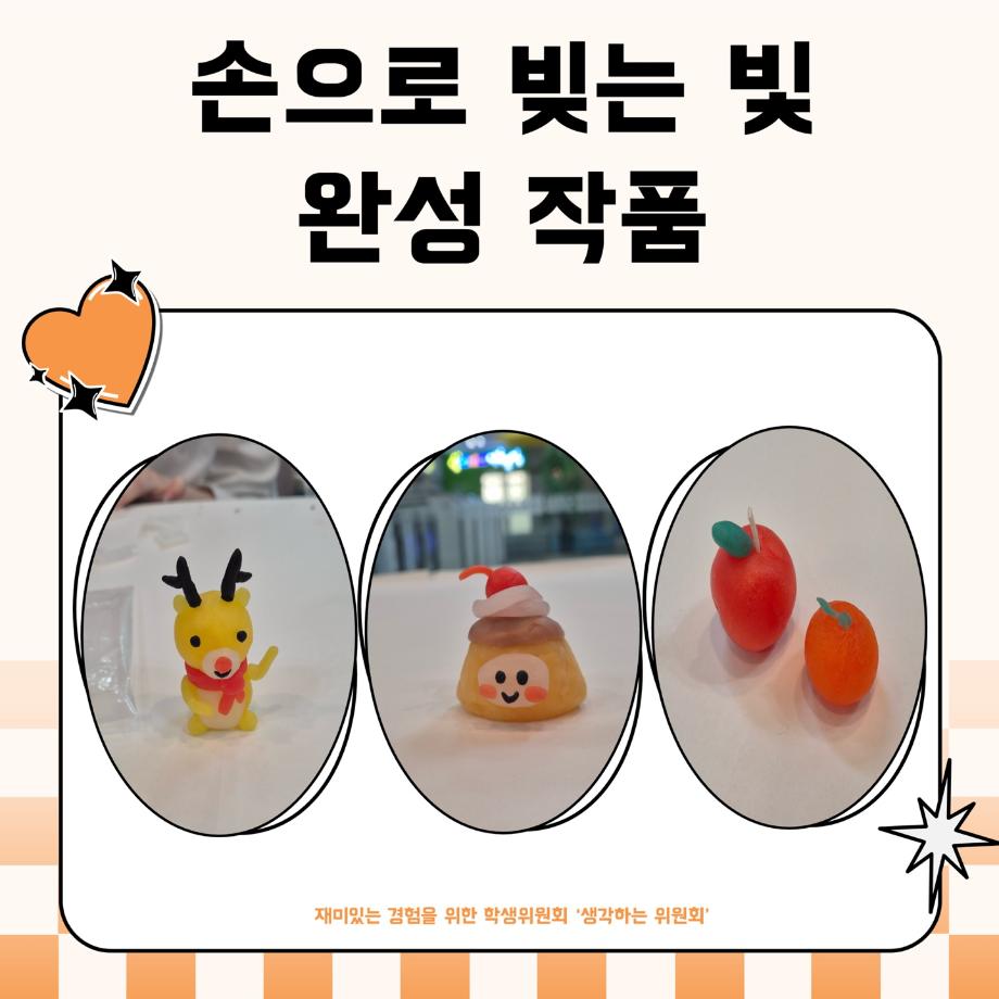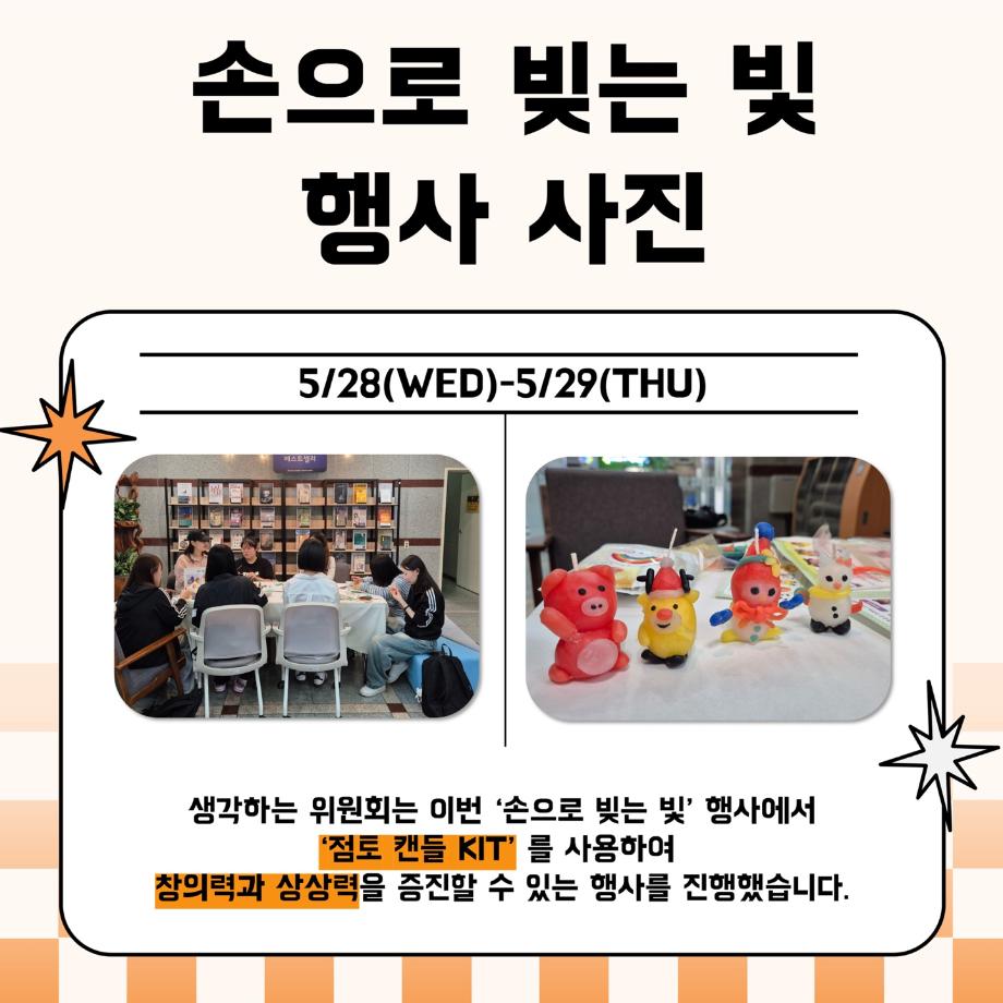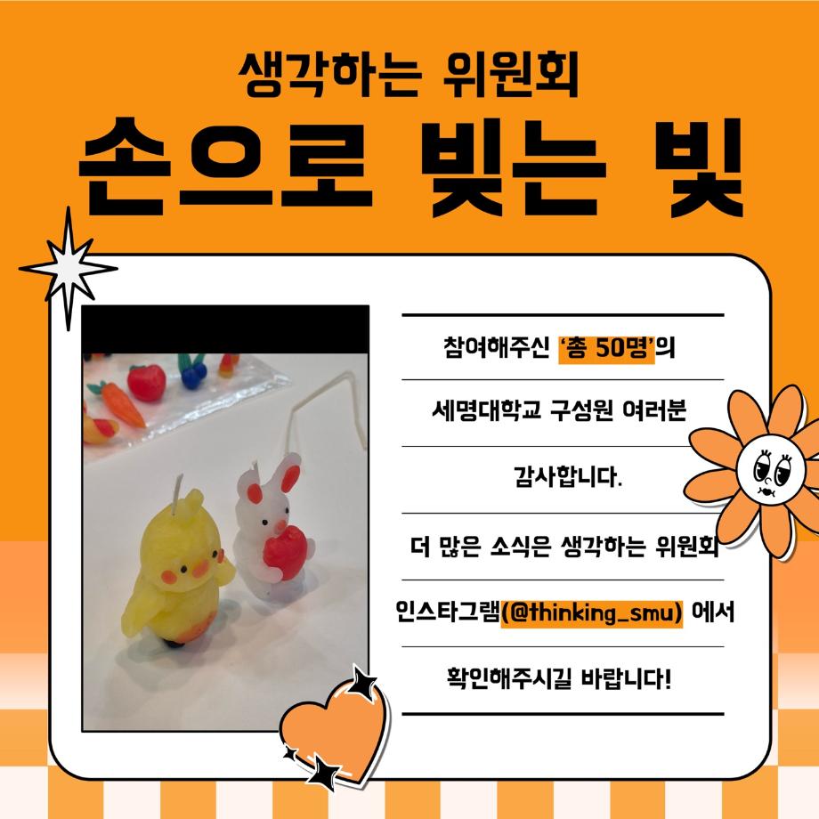 본문 시작 홈으로 포토갤러리 학생위원회 개요 학생위원회 소개 공지사항 활동결과 홈페이지가이드 포토갤러리 페이스북 트위터 프린트 [생각하는 위원회] 손으로 빚는 빛 학술정보원 890 2025-05-30 프로그램명 : 손으로 빚는 빛 일시 : 2025년 5월 28일(수)~29일(목) 13:30~16:00 장소 : 도서관 2층 로비 활동내용 : 점토양초 DIY로 나만의 양초 만들기 행사 참여자 : 50명 안녕하세요! 재미있는 경험을 위한 학생위원회 '생각하는 위원회'입니다 :) 손으로 빚는 빛 행사에 참여해주신 모든 분들께 감사드립니다! 앞으로도 생각하는 위원회의 활동들에 많은 관심 부탁드립니다🤍 목록 다음 [생각하는 위원회] 대형 현수막 문구 공모전 'Hear, 위로' 다음 [약속하는 위원회] 뽕뽕오락실 담당부서 : 장학복지팀 담당자 : - 연락처 : 043-649-1142 최종수정일 : 2024-10-26 만족도조사 만족도 조사 이 페이지에서 제공하는 정보에 대하여 만족하시나요? 매우만족 만족 보통 불만족 매우불만족