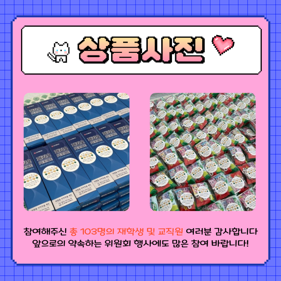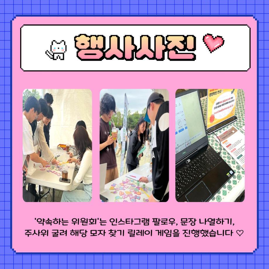 본문 시작 홈으로 포토갤러리 학생위원회 개요 학생위원회 소개 공지사항 활동결과 홈페이지가이드 포토갤러리 페이스북 트위터 프린트 [약속하는 위원회] 뽕뽕오락실 학술정보원 284 2025-09-24 안녕하세요 재미있는 경험을 위한 학생위원회 '약속하는 위원회' 입니다! 약속하는 위원회 행사인 뿅뿅! 약속오락실! 활동이 성황리에 마무리 되었습니다 :) [뿅뿅! 약속오락실! 행사 결과] 일시 : 2025년 9월 24일(수) 14시~17시 장소 : 학생회관 앞 광장 행사 참여자 : 103명 뿅뿅! 약속오락실! 행사에 참여해주신 모든 분들께 진심으로 감사드립니다! 추후에 이어질 약속하는 위원회 활동도 많은 관심 바랍니다! 목록 이전[생각하는 위원회] 손으로 빚는 빛 다음 [꽃피는 위원회] 꽃 돌려라 피어라 담당부서 : 장학복지팀 담당자 : - 연락처 : 043-649-1142 최종수정일 : 2024-10-26 만족도조사 만족도 조사 이 페이지에서 제공하는 정보에 대하여 만족하시나요? 매우만족 만족 보통 불만족 매우불만족