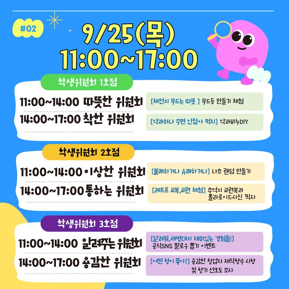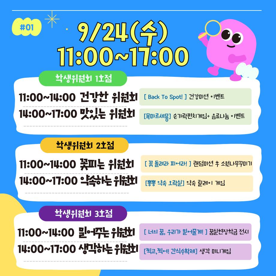 본문 시작 홈으로 공지사항 학생위원회 개요 학생위원회 소개 공지사항 활동결과 홈페이지가이드 프로그램 계획 프로그램 계획 세명대학교 공지사항 프로그램 계획 페이스북 트위터 프린트 [학생위원회] 청룡체전기간 학생위원회 전체활동안내 학생처 175 2025-09-24 청룡체전기간 학생위원회 활동을 아래와 같이 안내드리니 많은 참여 부탁드립니다. 목록 이전[약속하는 위원회]뿅뿅! 약속 오락실! 다음 [꽃피는 위원회] 꽃 돌려라 피어라! 담당부서 : 장학복지팀 담당자 : - 연락처 : 043-649-1142 최종수정일 : 2024-10-26 만족도조사 만족도 조사 이 페이지에서 제공하는 정보에 대하여 만족하시나요? 매우만족 만족 보통 불만족 매우불만족