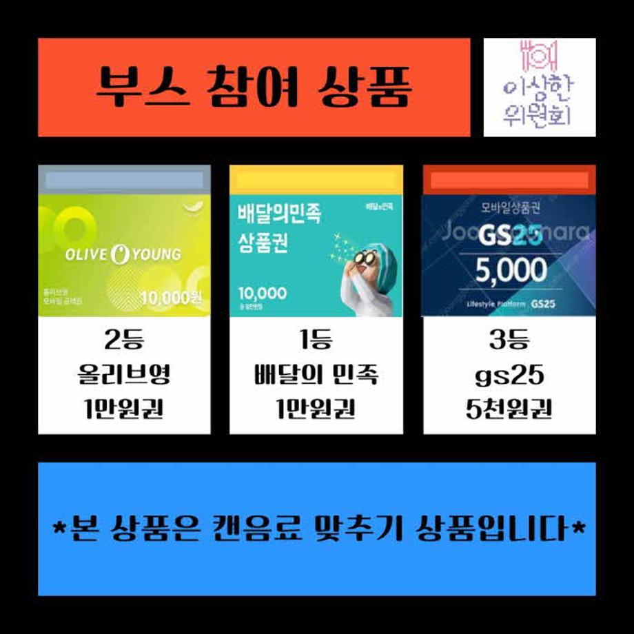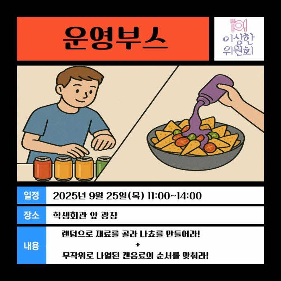 본문 시작 홈으로 공지사항 학생위원회 개요 학생위원회 소개 공지사항 활동결과 홈페이지가이드 프로그램 계획 프로그램 계획 세명대학교 공지사항 프로그램 계획 페이스북 트위터 프린트 [이상한 위원회] 유쾌하거나 불쾌하거나 학생처 307 2025-09-25 안녕하세요 🍽 이상한 위원회 🍽 입니다 청룡체전 기간 중 이상한 위원회에서 나쵸 만들기와 캔 위치 맞히기 게임을 진행하는 홍보 부스를 운영합니다! 🍭 이상한 위원회 인스타도 팔로우 하고 재미있는 경험하고 가세요🤗 ✅ 선착순 150명 ✅ 일시: 2025. 9. 25.(목) ✅ 시간: 11시~14시 ✅ 장소: 학생회관 앞 광장 많은 참여와 관심 부탁드립니다❤ 목록 이전[용감한 창업자] 어떤 향이 좋아? 이전[밀어주는 위원회] 너의 꿈, 우리가 밀어줄게! 담당부서 : 장학복지팀 담당자 : - 연락처 : 043-649-1142 최종수정일 : 2024-10-26 만족도조사 만족도 조사 이 페이지에서 제공하는 정보에 대하여 만족하시나요? 매우만족 만족 보통 불만족 매우불만족