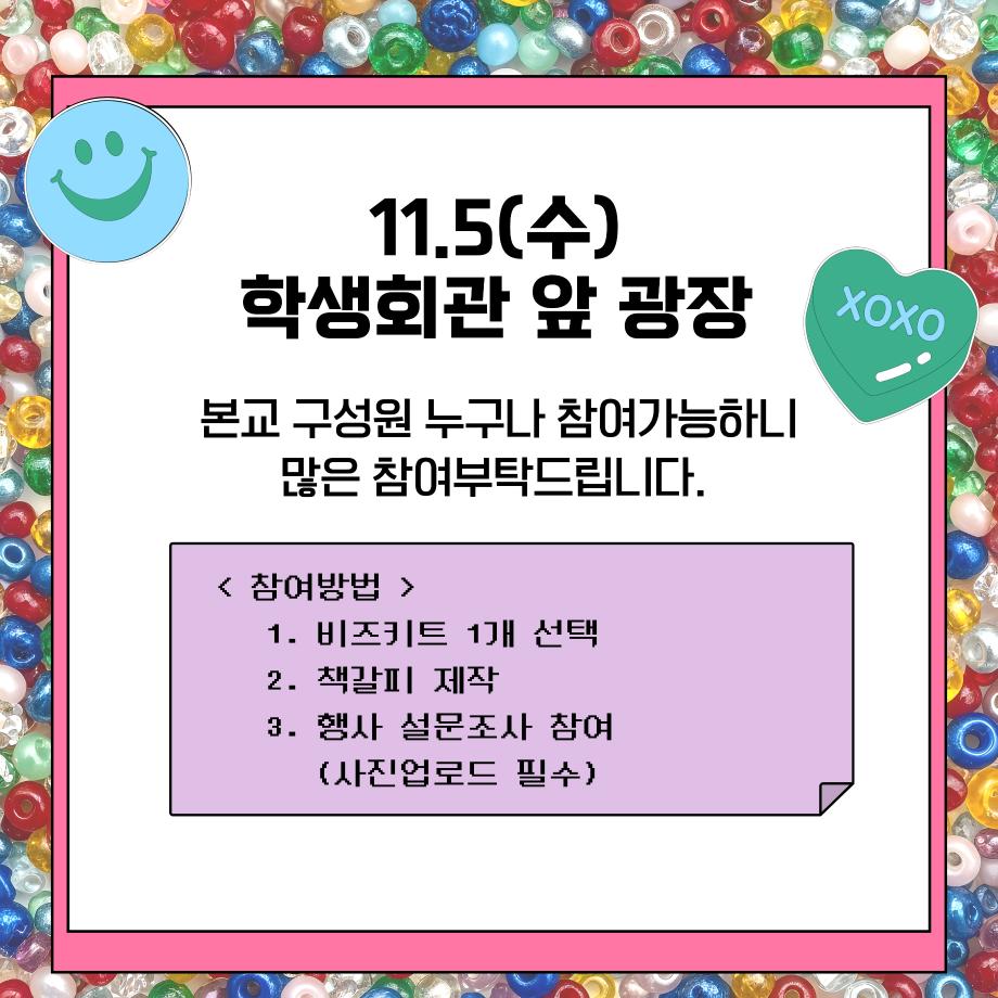 본문 시작 홈으로 공지사항 학생위원회 개요 학생위원회 소개 공지사항 활동결과 홈페이지가이드 프로그램 계획 프로그램 계획 세명대학교 공지사항 프로그램 계획 페이스북 트위터 프린트 [꽃피는 위원회] 북!마크!해버렸지뭐야 학생처 104 2025-11-05 꽃피는 위원회의 <비즈 책갈피 만들기> 행사명: 북!마크!해버렸지뭐야 행사일: 2025.11.05(수) 12시~15시 장 소: 학생회관 앞 광장 참여대상: 본교 구성원 선착순 100명 한정 많은 참여 부탁드립니다. 목록 이전[착한 위원회] 약과하나 주면 안잡아 먹지 다음 [맛있는 위원회] 얼죽아 모임에 초대합니다 담당부서 : 장학복지팀 담당자 : - 연락처 : 043-649-1142 최종수정일 : 2024-10-26 만족도조사 만족도 조사 이 페이지에서 제공하는 정보에 대하여 만족하시나요? 매우만족 만족 보통 불만족 매우불만족