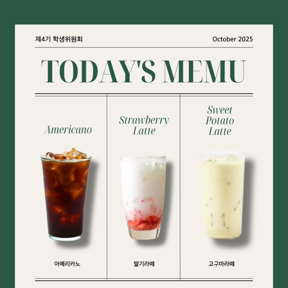 본문 시작 홈으로 공지사항 학생위원회 개요 학생위원회 소개 공지사항 활동결과 홈페이지가이드 프로그램 계획 프로그램 계획 세명대학교 공지사항 프로그램 계획 페이스북 트위터 프린트 [맛있는 위원회] 얼죽아 모임에 초대합니다 학생처 102 2025-11-05 행사명: 얼죽아 모임에 초대합니다 일시: 2025. 11. 05. (수), 12:00~15:00 장소: 세명스퀘어 (학생회관 앞) 내용: 맛있는 위원회 공식 인스타그램 계정 팔로우 후, 음료 수령 음료종류: 아메리카노, 딸기라떼, 고구마라떼 목록 이전[꽃피는 위원회] 북!마크!해버렸지뭐야 다음 [건강한 위원회] 보틀크래시 담당부서 : 장학복지팀 담당자 : - 연락처 : 043-649-1142 최종수정일 : 2024-10-26 만족도조사 만족도 조사 이 페이지에서 제공하는 정보에 대하여 만족하시나요? 매우만족 만족 보통 불만족 매우불만족