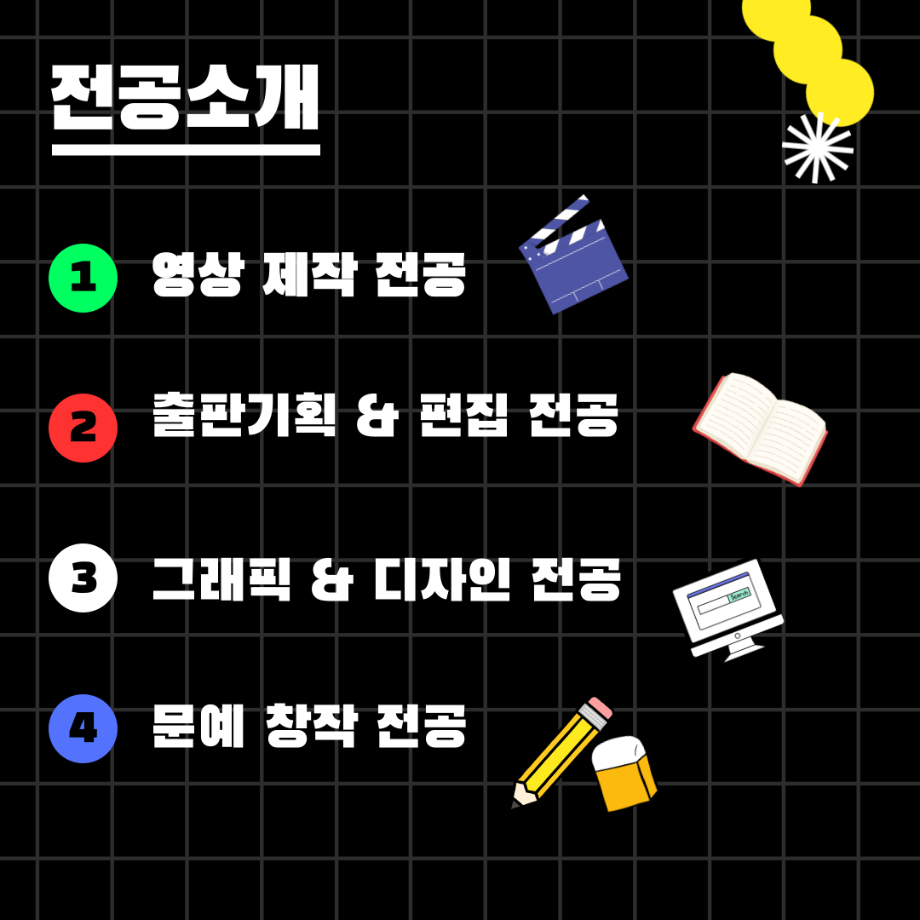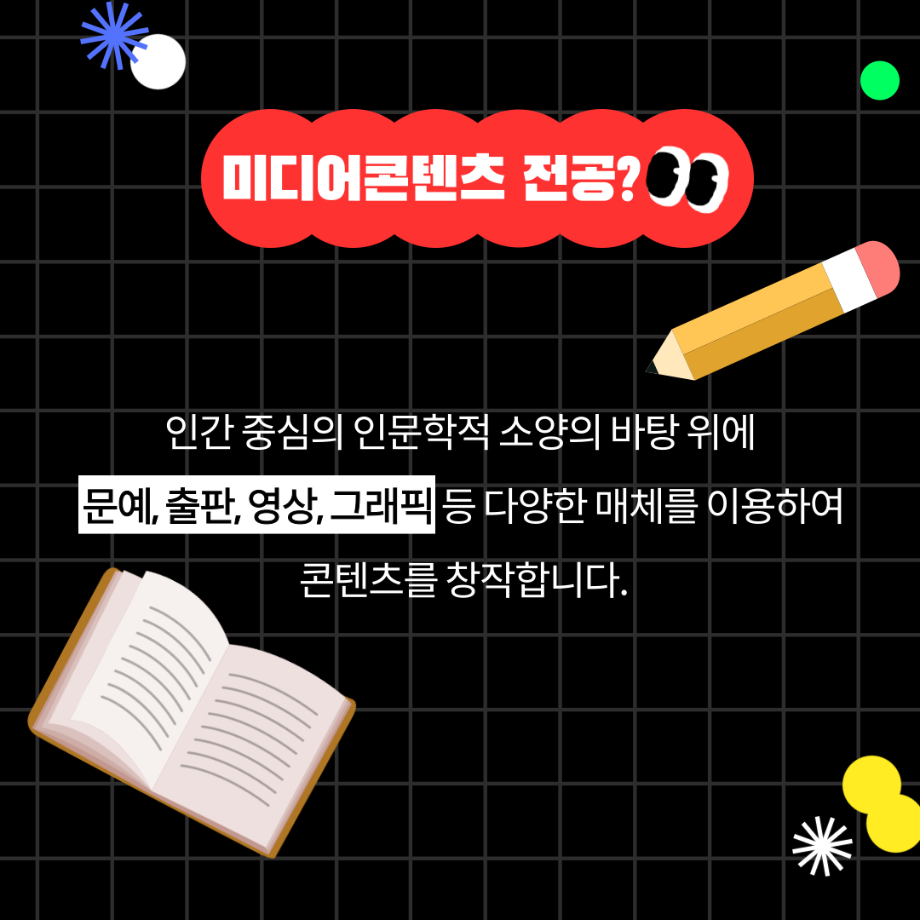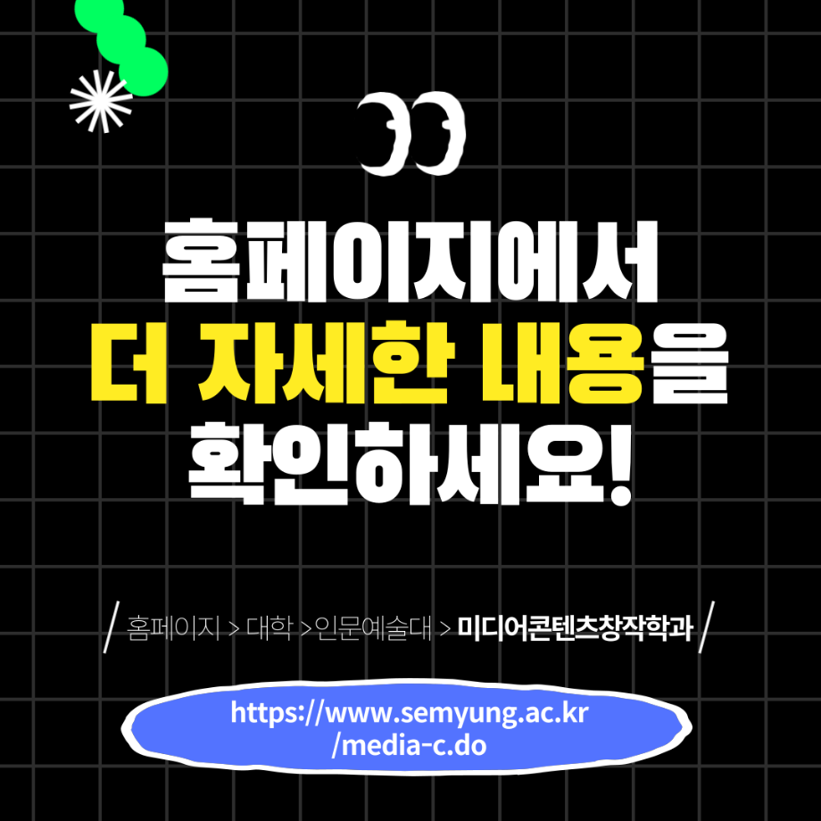 본문 시작 홈으로 MCC News 학과소개 교수소개 학과과정 MCC News MCC SNS 홈페이지가이드 미디어 정보통 학과 및 재학생 교수 및 졸업생 미디어 정보통 미디어 정보통 페이스북 트위터 프린트 미디어콘텐츠창작학과 궁금해?! 미디어콘텐츠창작학과 811 2025-07-21 🎥미디어콘텐츠창작학과❗️궁금해❓📖 영상부터 출판, 그래픽, 소설까지! 내 아이디어를 콘텐츠로 만드는 곳. 창작의 모든 과정을 직접 경험하고, 나만의 이야기를 세상에 전하세요✨ 자세한 내용은 미콘창 인스타그램에서 확인하세요 @smu_mcc 목록 이전여름방학 갈만한 여행지 추천.zip 다음 2025 시청자미디어대상 방송영상공모전 담당부서 : 미디어콘텐츠창작학과 담당자 : - 연락처 : 043-649-1741 최종수정일 : 2024-10-26 만족도조사 만족도 조사 이 페이지에서 제공하는 정보에 대하여 만족하시나요? 매우만족 만족 보통 불만족 매우불만족