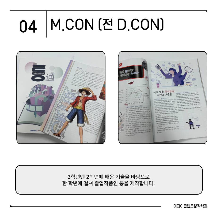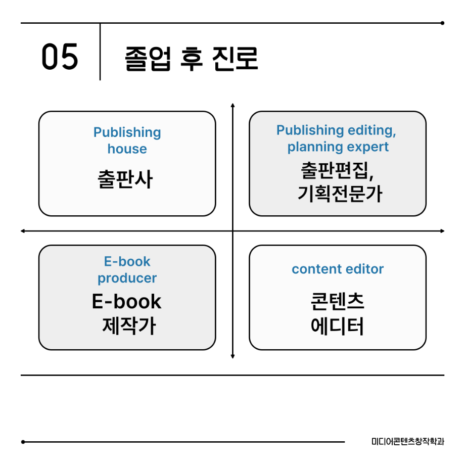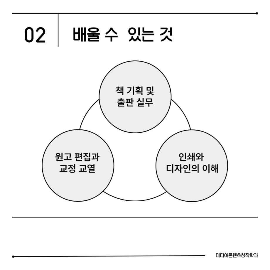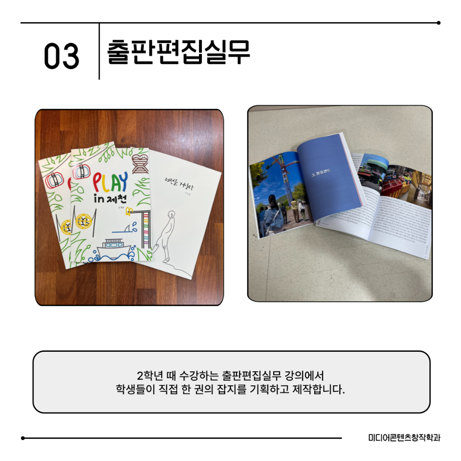 본문 시작 홈으로 MCC News 학과소개 교수소개 학과과정 MCC News MCC SNS 홈페이지가이드 미디어 정보통 학과 및 재학생 교수 및 졸업생 미디어 정보통 미디어 정보통 페이스북 트위터 프린트 📖미디어콘텐츠창작학과 | 출판 전공 미디어콘텐츠창작학과 696 2025-08-19 출판 전공에서는 원고 편집, 기획, 디자인까지 책 제작의 모든 과정을 직접 경험합니다. 한 권의 책이 나오기까지는 수많은 손길이 필요합니다. 출판 전공은 글을 다듬고, 디자인하고, 기획하며 세상에 새로운 이야기를 전하는 과정을 배우는 곳입니다. 목록 이전경험이 실력이 되는 세명대학교 다음 📖 미디어콘텐츠창작학과 | 소설 전공 담당부서 : 미디어콘텐츠창작학과 담당자 : - 연락처 : 043-649-1741 최종수정일 : 2024-10-26 만족도조사 만족도 조사 이 페이지에서 제공하는 정보에 대하여 만족하시나요? 매우만족 만족 보통 불만족 매우불만족