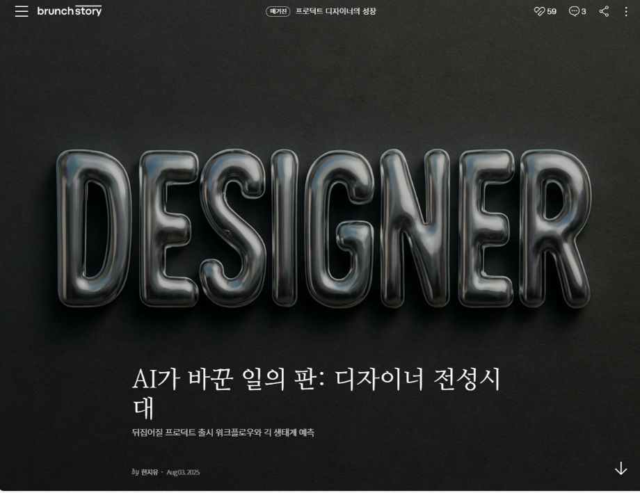 본문 시작 홈으로 AI 학과소개 학과과정 시영소식 입학/취업 AI 학과자랑 SNS소통 홈페이지가이드 AI 콘텐츠 연구소(AI 디자인) 디자인 정보 AI 콘텐츠 연구소(AI 디자인) AI 콘텐츠 연구소(AI 디자인) 페이스북 트위터 프린트 '풀스택 디자이너의 시대' 시각영상디자인학과 319 2025-08-09 한지유 디자이너님이 작성하신 글인데 '풀스택 디자이너의 시대'라는 표현이 와 닿는 것 같습니다. AI가 가져오고 있는 실무 현장의 인재와 프로세스 변화가 잘 정리된 글이니 한 번씩 읽어보시면 도움이 되시겠습니다 : ) https://brunch.co.kr/@jiyuhan/111 목록 이전"2026년 광고 40%가 AI로 제작 다음 AI가 만든 광고 만족도조사 만족도 조사 이 페이지에서 제공하는 정보에 대하여 만족하시나요? 매우만족 만족 보통 불만족 매우불만족