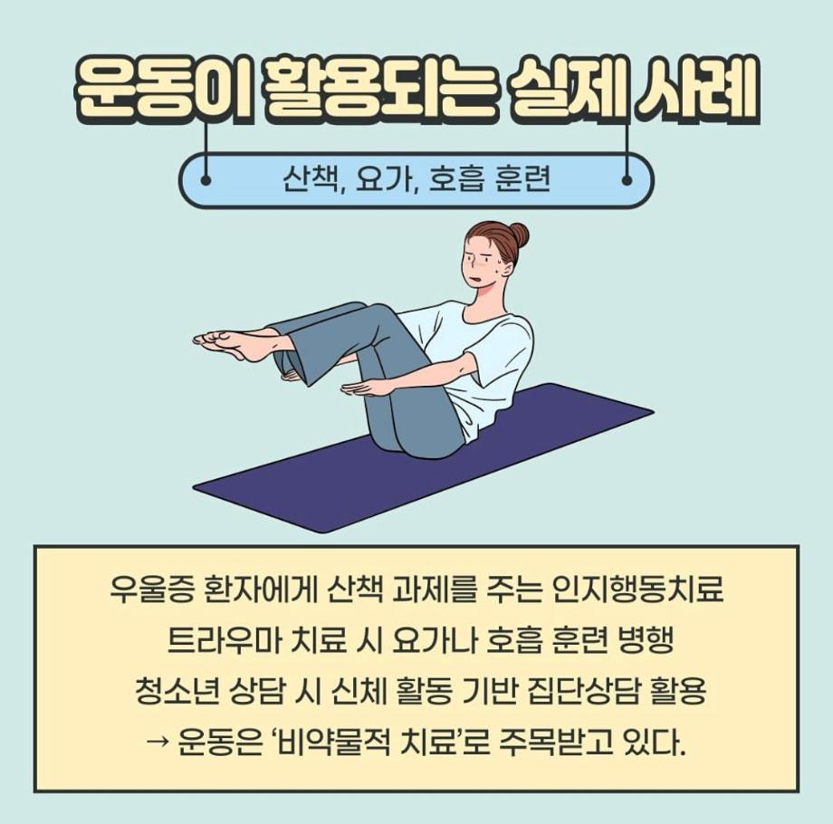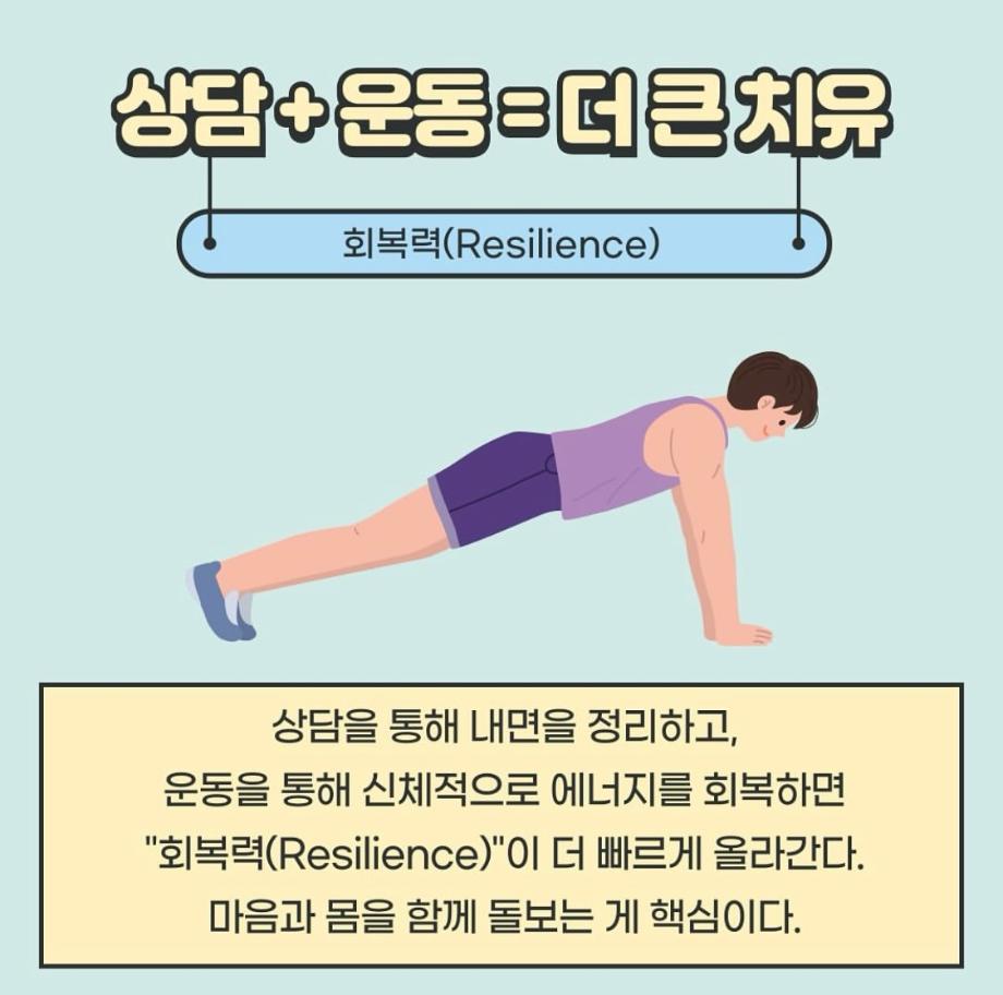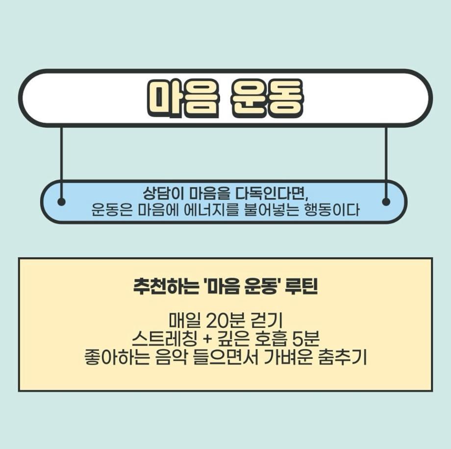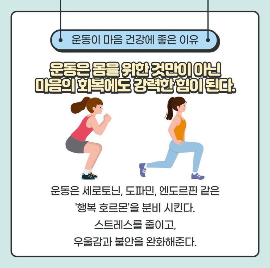 본문 시작 홈으로 학과 커뮤니티 학부소개 교수소개 교육목표 입학안내 학과 커뮤니티 대학원 커뮤니티 홈페이지가이드 학과 갤러리 학과소식 학사일정 학과 갤러리 학과 갤러리 페이스북 트위터 프린트 운동과 상담심리 상담심리학과 647 2025-05-17 안녕하세요 세명대학교 상담심리학과 학생회 오비르입니다 ! 오늘은 운동과 상담심리의 관계에 대해 알려드리겠습니다. 몸을 움직이면 마음도 움직인다! 운동은 세로토닌, 도파민, 엔도르핀 같은 '행복 호르몬'을 분비시켜 스트레스를 줄이고, 우울감과 불안을 완화해 준다고 합니다. 몸과 마음이 지쳐있다면 운동을 통해 회복하는 시간을 가져 보는 건 어떨까요? 목록 이전윤리적 딜레마 & 해결방법 다음 음악이 심리에 미치는 영향 만족도조사 만족도 조사 이 페이지에서 제공하는 정보에 대하여 만족하시나요? 매우만족 만족 보통 불만족 매우불만족