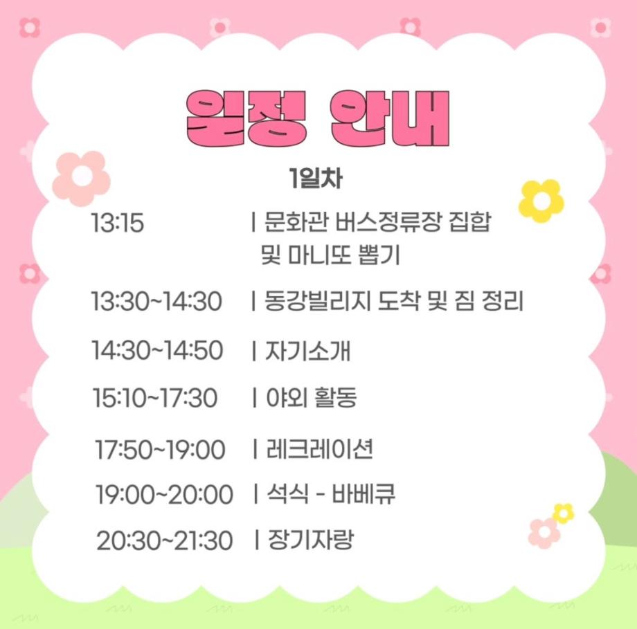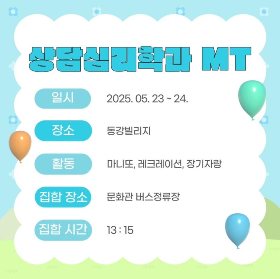본문 시작 홈으로 학과 커뮤니티 학부소개 교수소개 교육목표 입학안내 학과 커뮤니티 대학원 커뮤니티 홈페이지가이드 학과 갤러리 학과소식 학사일정 학과 갤러리 학과 갤러리 페이스북 트위터 프린트 상담심리학과 MT 일정 안내 상담심리학과 605 2025-05-22 안녕하세요 상담심리학과 학생회 오비르입니다 ! 2025년 상담심리학과 MT 일정에 대해 안내드립니다 ~ 일시: 2025. 5. 23. (금) ~ 24. (토) 장소: 동강빌리지 (강원 영월군 영월읍 동강로 225) 집합 장소: 세명대학교 문화관 집합 시간: 13시 15분 집합 시간에 맞춰 모두 늦지 않게 와주시길 바랍니다. 상담심리학과의 첫 MT인 만큼 사고 없이 안전하고 즐겁게 다녀왔으면 좋겠습니다 ღゝ◡╹)ノ♡ 목록 이전음악이 심리에 미치는 영향 다음 2025 상담심리학과 MT 만족도조사 만족도 조사 이 페이지에서 제공하는 정보에 대하여 만족하시나요? 매우만족 만족 보통 불만족 매우불만족