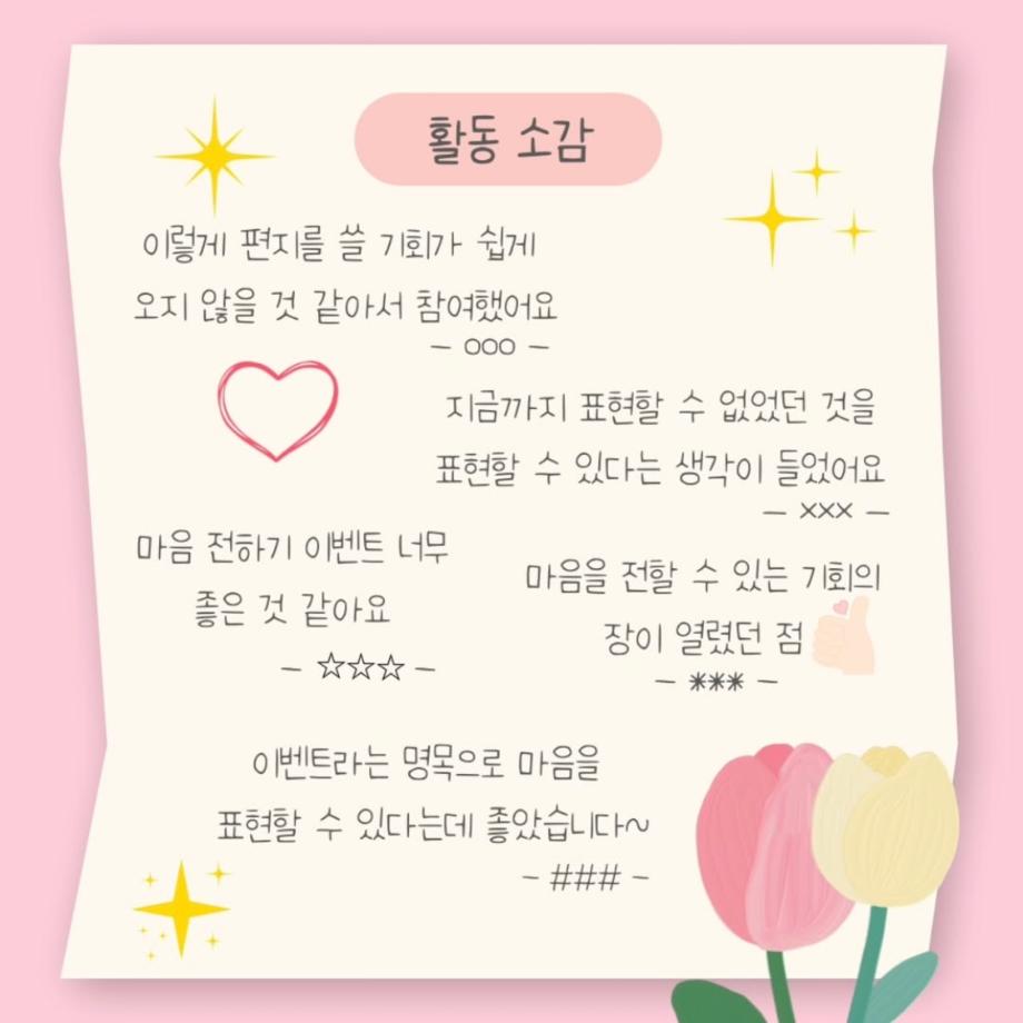 본문 시작 홈으로 학과 커뮤니티 학부소개 교수소개 교육목표 입학안내 학과 커뮤니티 대학원 커뮤니티 홈페이지가이드 학과 갤러리 학과소식 학사일정 학과 갤러리 학과 갤러리 페이스북 트위터 프린트 상담심리학과 표현데이 활동 소감 상담심리학과 440 2025-06-02 안녕하세요 세명대학교 상담심리학과입니다! 상담심리학과의 유일한 기획 동아리 GRIT에서 4월 28일부터 5월 9일까지 표현데이 이벤트를 진행했습니다! 평소 마음을 전하지 못했던 대상에게 편지로 마음을 전할 수 있어 모두에게 의미 있는 시간이 되었던 것 같습니다 :) 앞으로도 다양한 이벤트를 진행한다고 하니 많은 관심 부탁드립니다~ 목록 이전상담심리학과 표현데이 이벤트 다음 6월 학사일정 만족도조사 만족도 조사 이 페이지에서 제공하는 정보에 대하여 만족하시나요? 매우만족 만족 보통 불만족 매우불만족