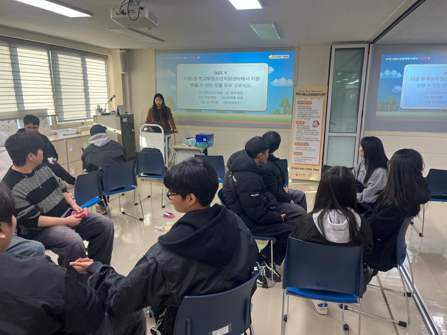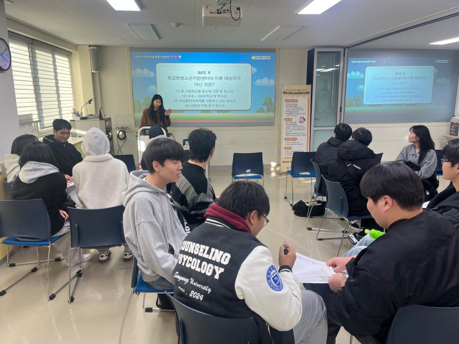 본문 시작 홈으로 학과 커뮤니티 학부소개 교수소개 교육목표 입학안내 학과 커뮤니티 대학원 커뮤니티 홈페이지가이드 학과 갤러리 학과소식 학사일정 학과 갤러리 학과 갤러리 페이스북 트위터 프린트 2025학년도 2학기 현장견학 상담심리학과 248 2025-11-20 안녕하세요 세명대학교 상담심리학과입니다! 지난 3일 상담심리학과 1, 2학년 학생들은 제천시청소년상담복지센터로 현장견학을 떠났습니다! 센터 견학과 퀴즈 프로그램을 통해 상담복지센터에 대해 알 수 있는 뜻깊은 시간이 됐습니다. 오늘의 견학이 앞으로의 진로에 도움이 되고 결정할 수 있는 데에 필요한 시간이 되었으면 합니다 :) 목록 이전나와 어울리는 심리이론은? 다음 12월 학사일정 만족도조사 만족도 조사 이 페이지에서 제공하는 정보에 대하여 만족하시나요? 매우만족 만족 보통 불만족 매우불만족